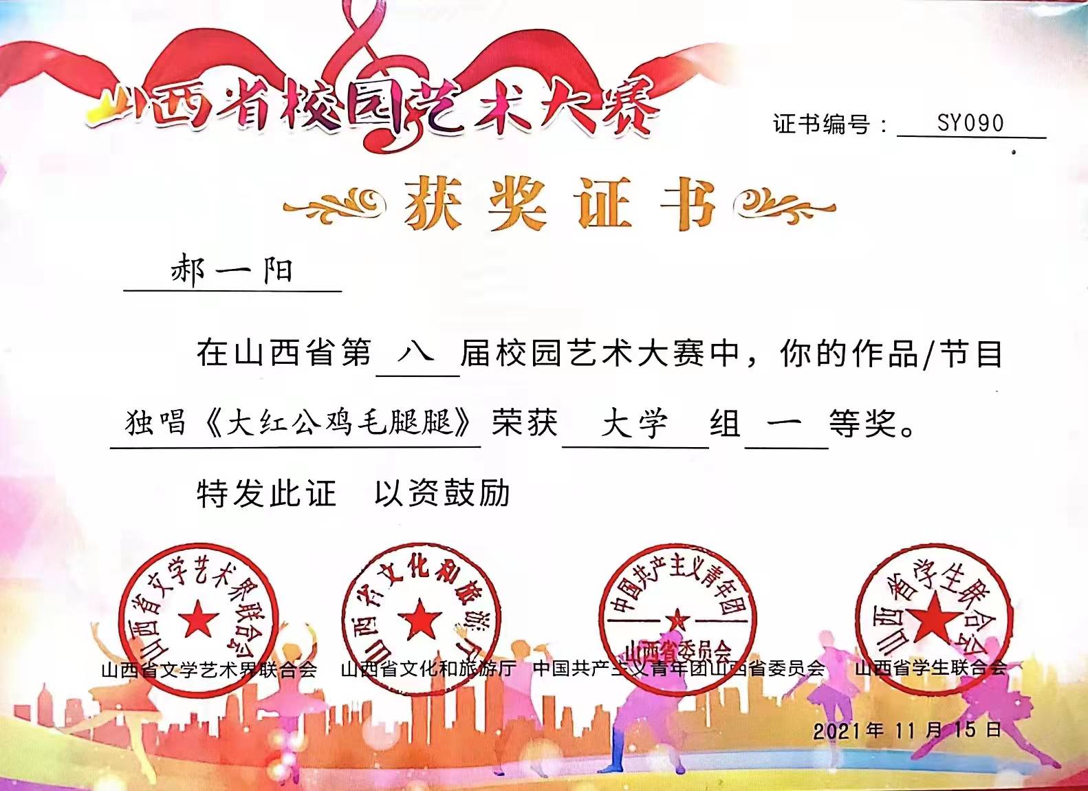 在庆祝中国共产党成立100周年之际,山西省文学艺术界联合会、山西省文化和旅游厅、共青团山西省委、山西省学生联合会于2021年4月至11月联合举办“第八届山西省校园艺术大赛”, 民族声乐系系主任陈红玲教授荣获“优秀指导教师奖”,民族声乐系学生郝一阳荣获大学生组独唱“一等奖”。