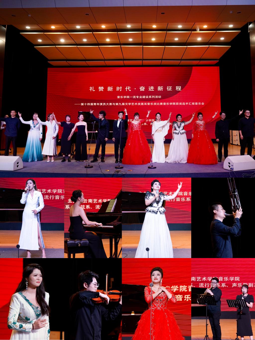 本场汇报音乐会以“礼赞新时代·奋进新征程”为主题,展示了两次大赛获奖选手的参赛作品以及学院部分教师的原创音乐作品。演出作品包含美声、民族、通俗三种唱法,以及民族器乐笙、西洋器乐钢琴、小提琴、圆号、单簧管等器乐门类的演奏。音乐会通过独唱、小合唱、独奏、重奏等新颖多样的演出形式和演职人员精湛的表演技艺赢得了观众的热烈掌声。