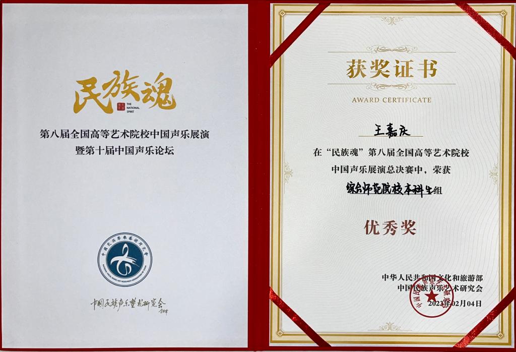 2023年2月,十大买球的正规网站师生在“民族魂·第八届全国高等艺术院校中国声乐展演”中喜获佳绩,研究生姚弦歌荣获综合师范院校研究生组金奖,指导教师林林教授获优秀指导教师奖。此外,十大买球的正规网站在本次展演中斩获佳绩的学生还有王嘉庆荣获综合师范院校本科生组优秀奖,指导教师为陈红玲教授;李鑫珂获综合师范院校研究生组优秀奖,指导教师为舒丽萍副教授。