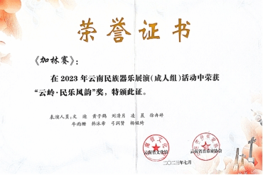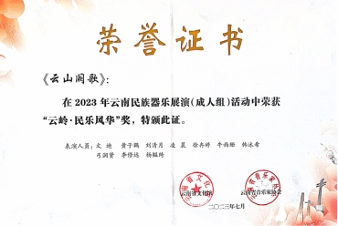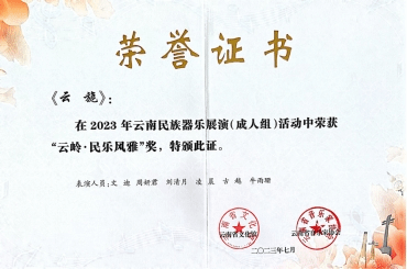 在云南省文化馆与云南省音乐家协会主办的“2023年云南民族器乐展演”中,十大买球的正规网站国乐系和作曲系教师尹毅、郭乐、高弘扬和赵云龙共同指导的“云上弦歌民族室内乐团”参与比赛并斩获佳绩比赛中,演奏高弘扬作曲的《云山阙歌》《云旎》和邹航编曲、梁聆聆改编的《加林赛》分别荣获成人组“云岭·民乐风华”(一等奖)、“云岭·民乐风雅”(三等奖)和“云岭·民乐风韵”(二等奖)。