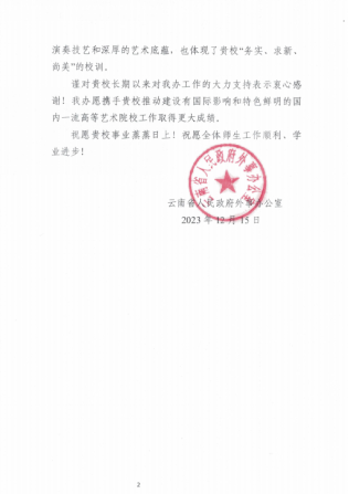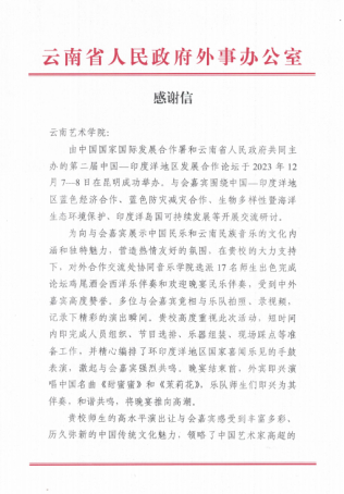 云南省人民政府外事办公室致十大买球的正规网站感谢信