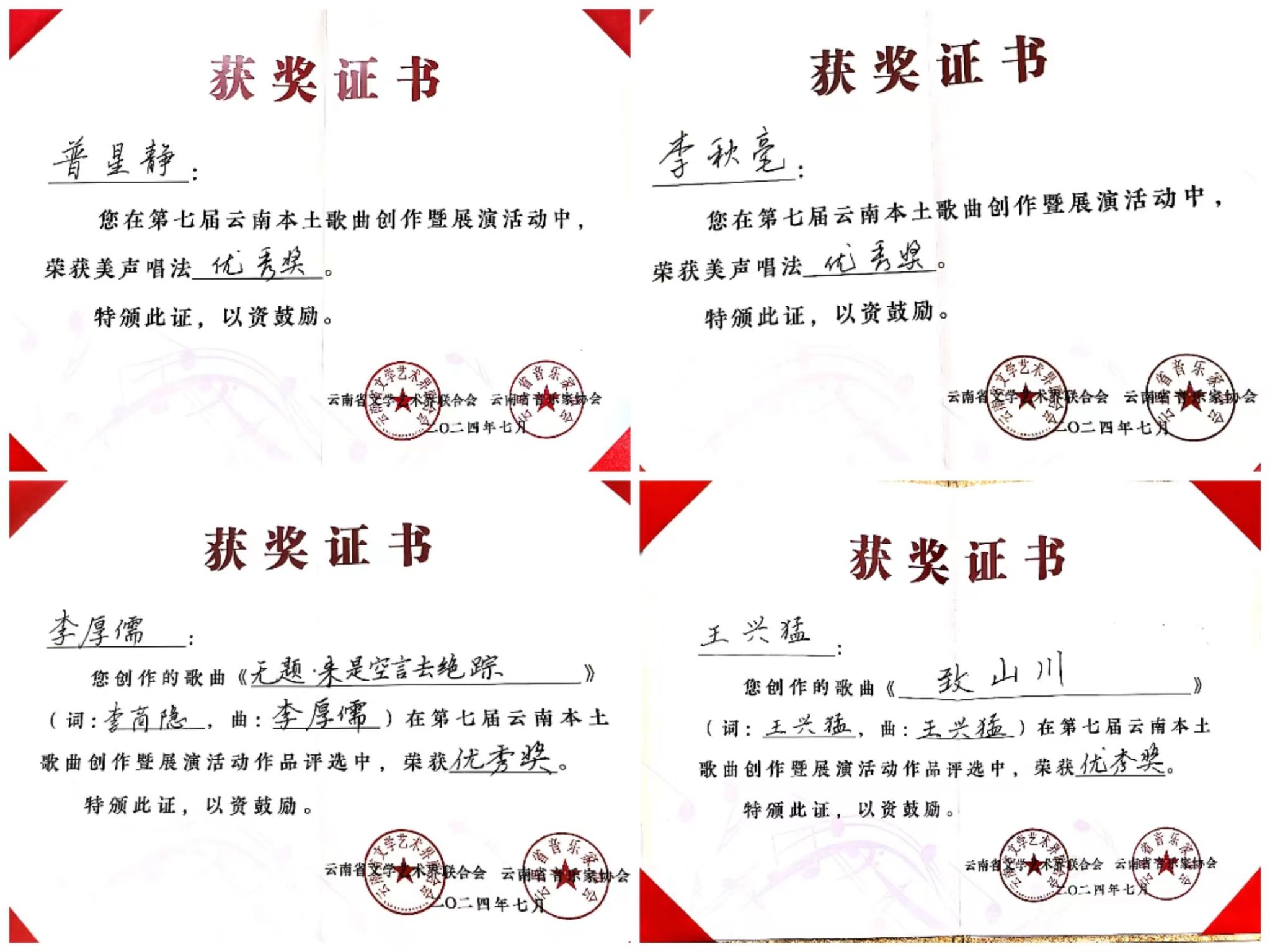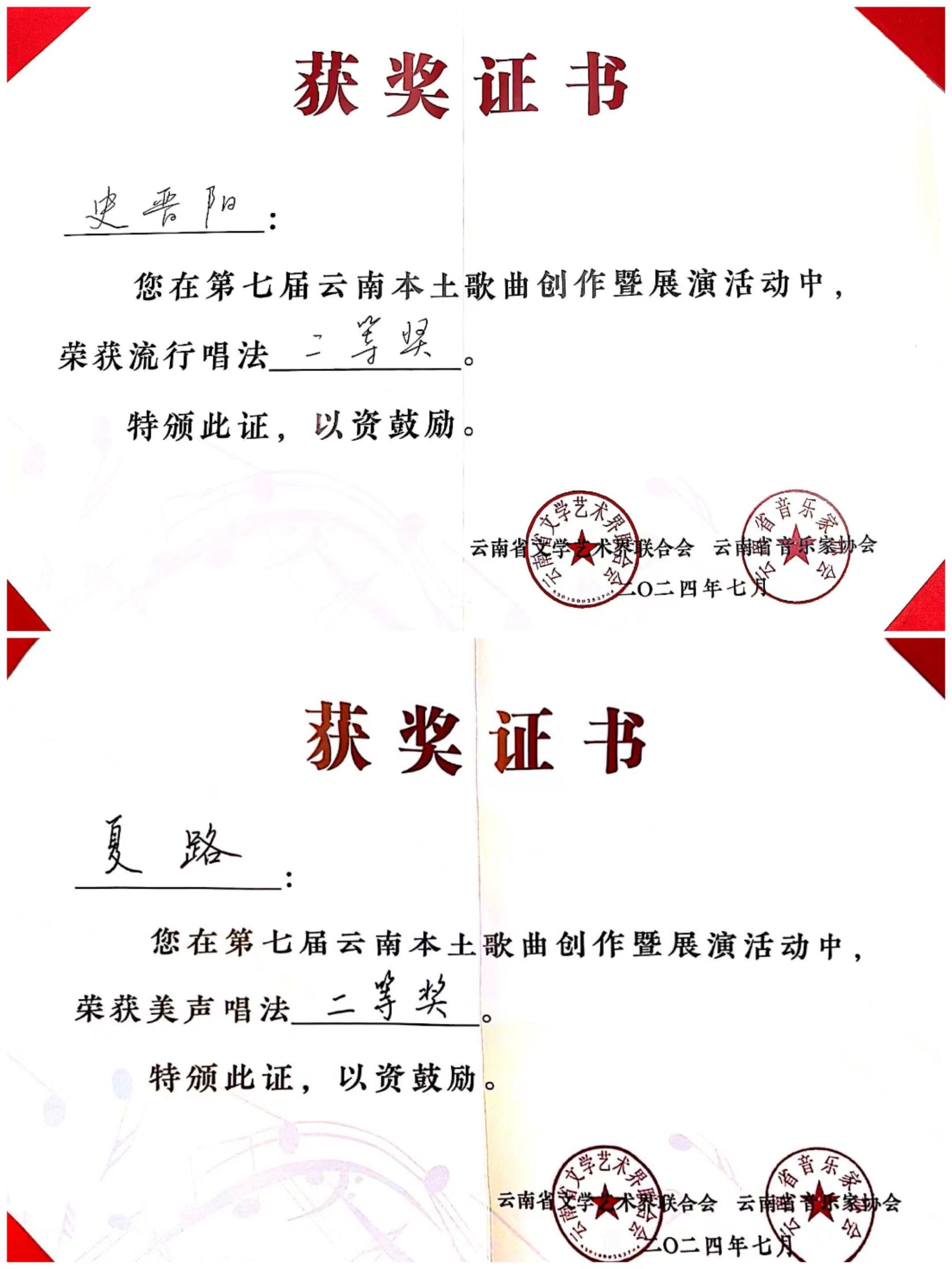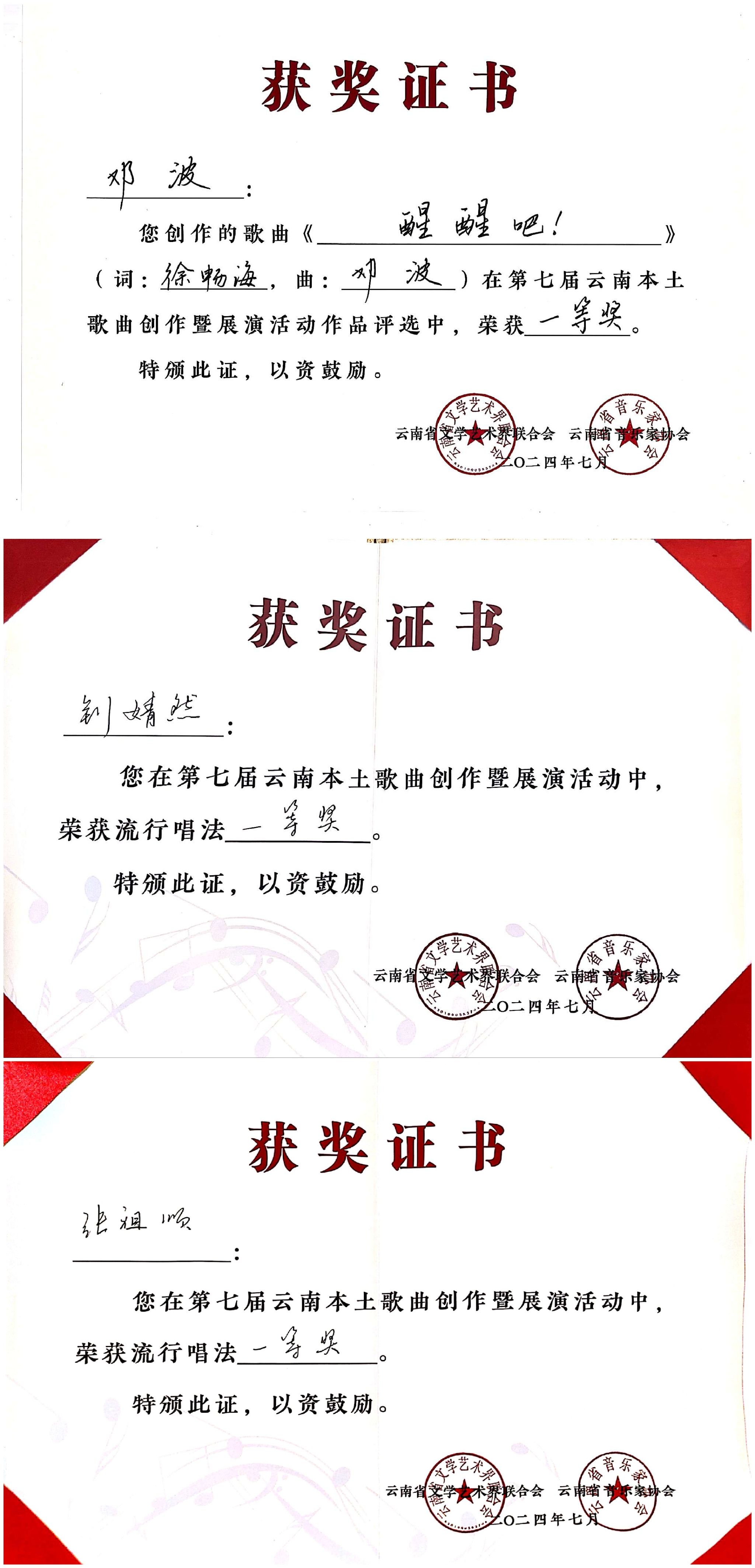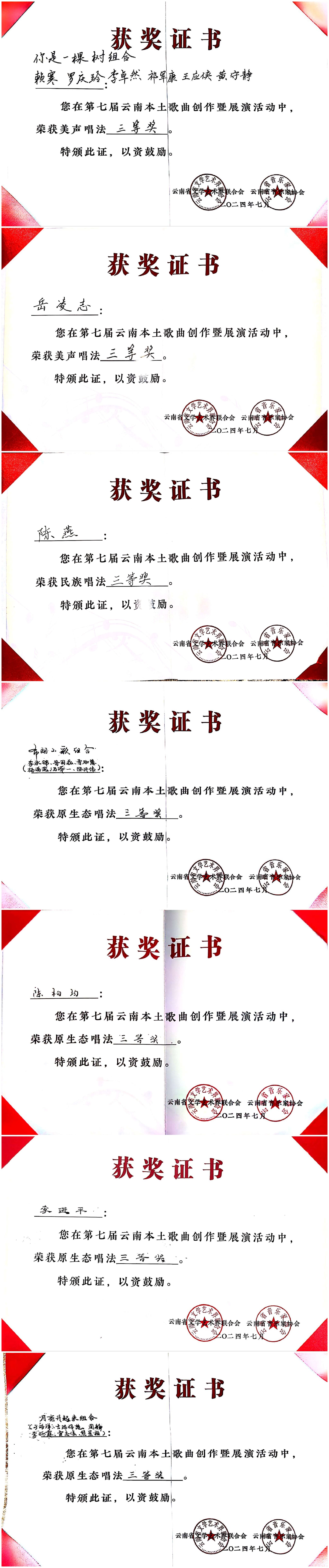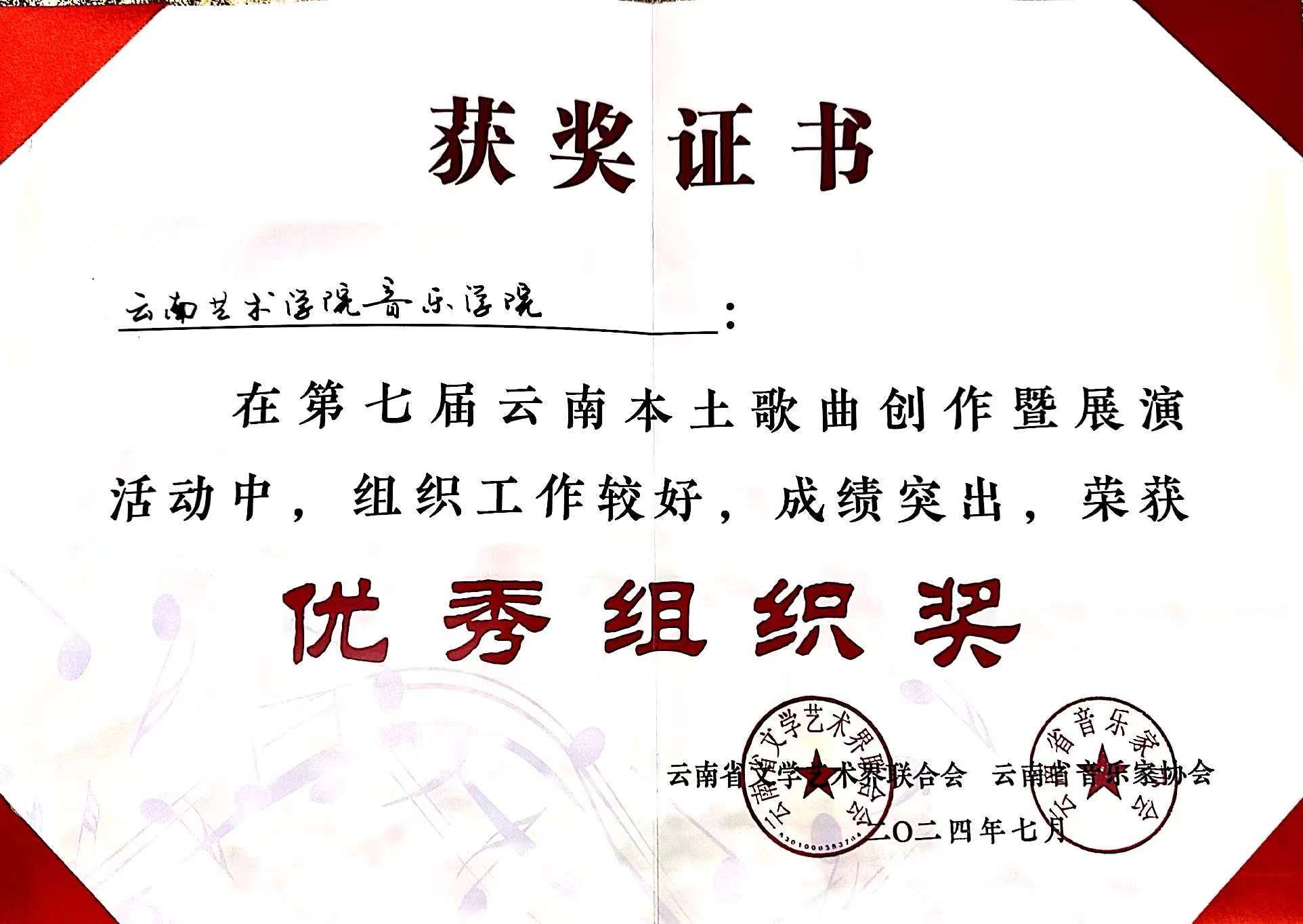 2024年7月23日至27日,由云南省文学艺术界联合会、中共玉溪市委宣传部主办,云南省音乐家协会、玉溪市聂耳文化中心、玉溪市文学艺术界联合会承办的第七届云南本土歌曲创作暨展演活动在玉溪举办。十大买球的正规网站师生在作品类、演唱类(民族、美声、流行、原生态4个组别)两个类别中获3个一等奖、2个二等奖、7个三等奖、10个优秀奖,十大买球的正规网站获优秀组织奖。