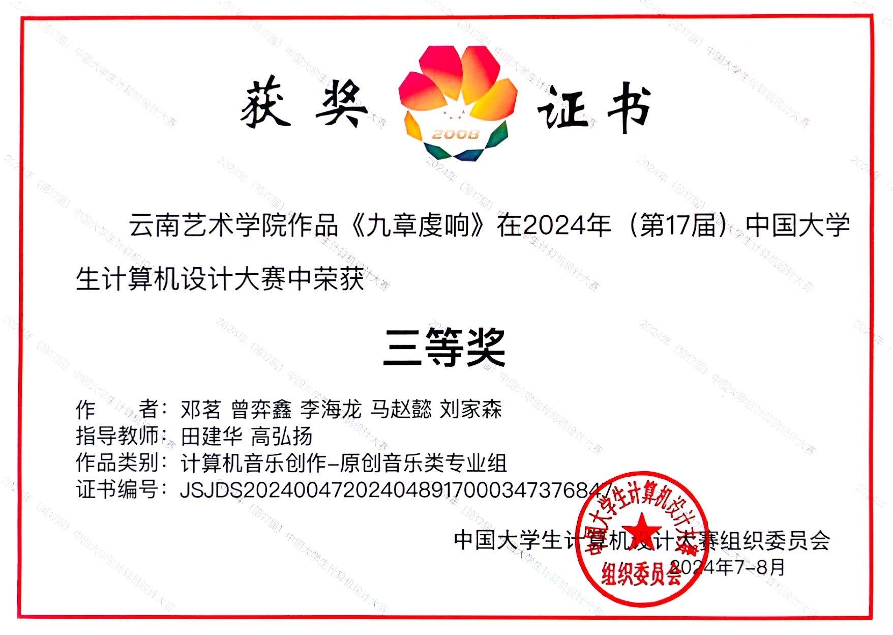 2024年(第17届)中国大学生计算机设计大赛决赛于8月18日开幕、8月21日落幕,该赛事汇集了全国各大高校的精英学子,其中计算机音乐创作组有全国各大高校共106件作品进入决赛。十大买球的正规网站作曲系教师指导的两部作品以云南省一等奖的成绩进入全国总决赛,两部作品均荣获计算机音乐创作-原创音乐类专业组三等奖。