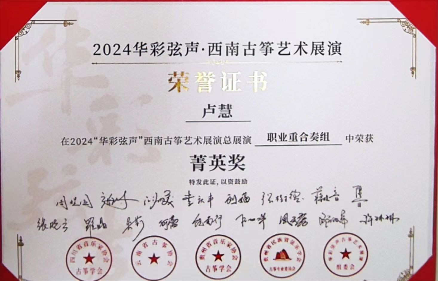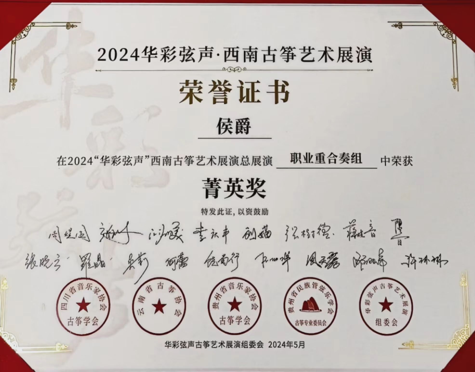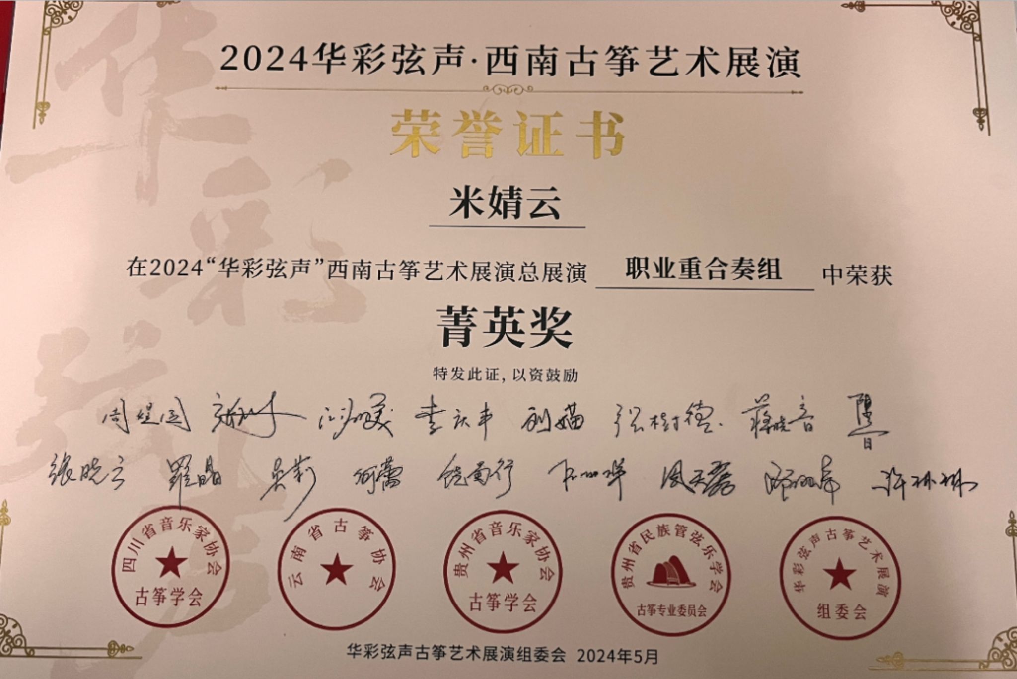 2024年5月1日至5日,由四川省音乐家协会指导,四川省音乐家协会古筝学会、云南省古筝协会、贵州民族管弦乐学会古筝专业委员会、贵州省音乐家协会古筝学会主办的“华彩弦声”第一届西南云贵川渝古筝艺术展演在四川十大买球的正规网站举行。十大买球的正规网站国乐系教师林恬、陈珂井指导的2023级学生侯爵、卢慧、米婧云荣获职业重合奏组菁英奖。