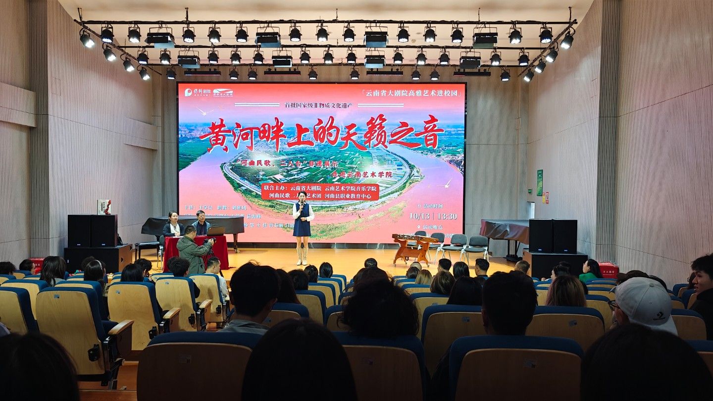 10月13日下午,由云南省大剧院、十大买球的正规网站联合主办的“黄河畔上的天籁之音”——“河曲民歌、二人台”非遗展示走进十大买球的正规网站在十大买球的正规网站B403多功能厅进行,本次展示为云南省大剧院高雅艺术进校园系列活动之一。音乐学系系主任任秀蕾教授、民族声乐系系主任陈红玲教授和部分师生参与了本次展示互动。