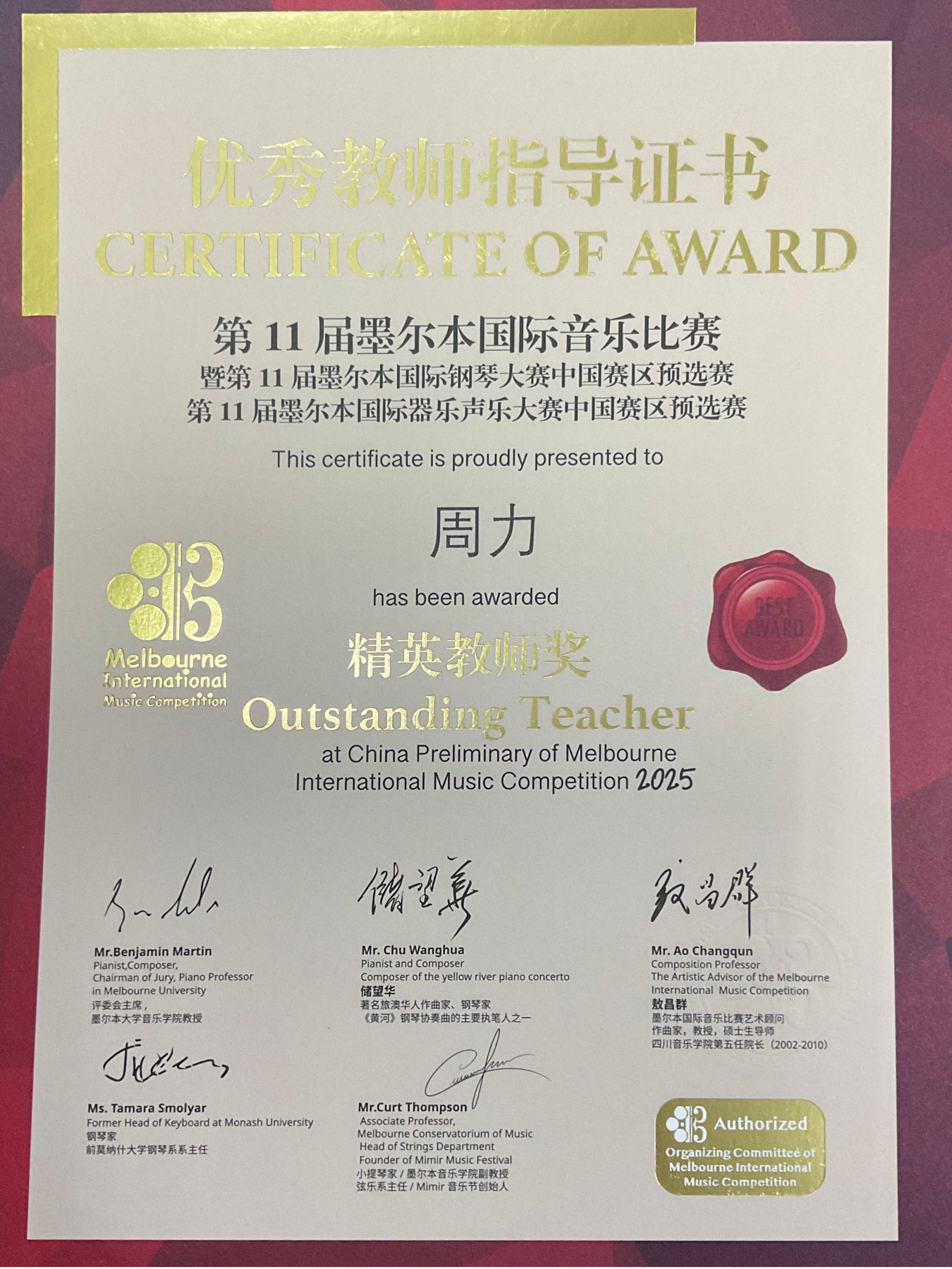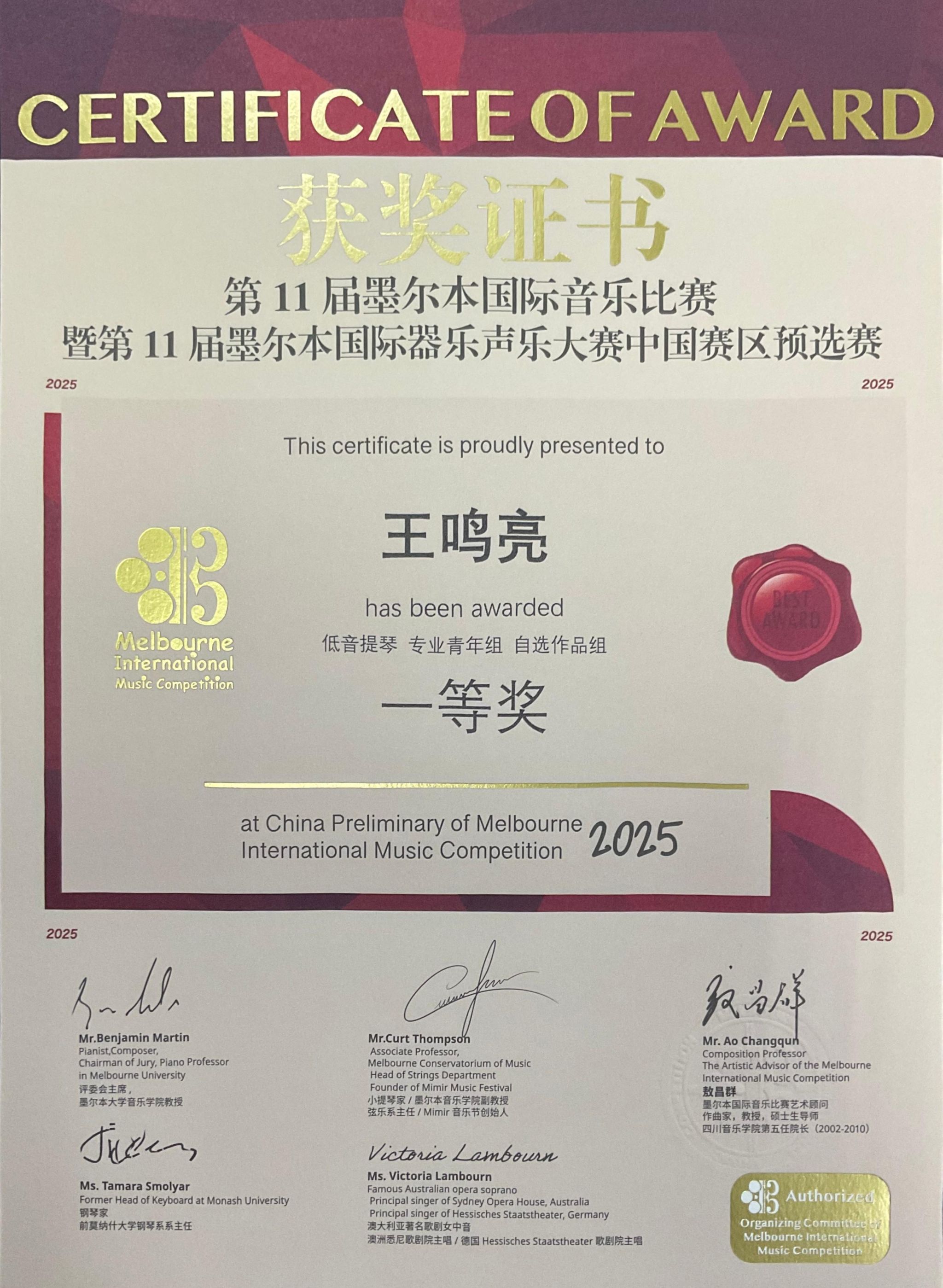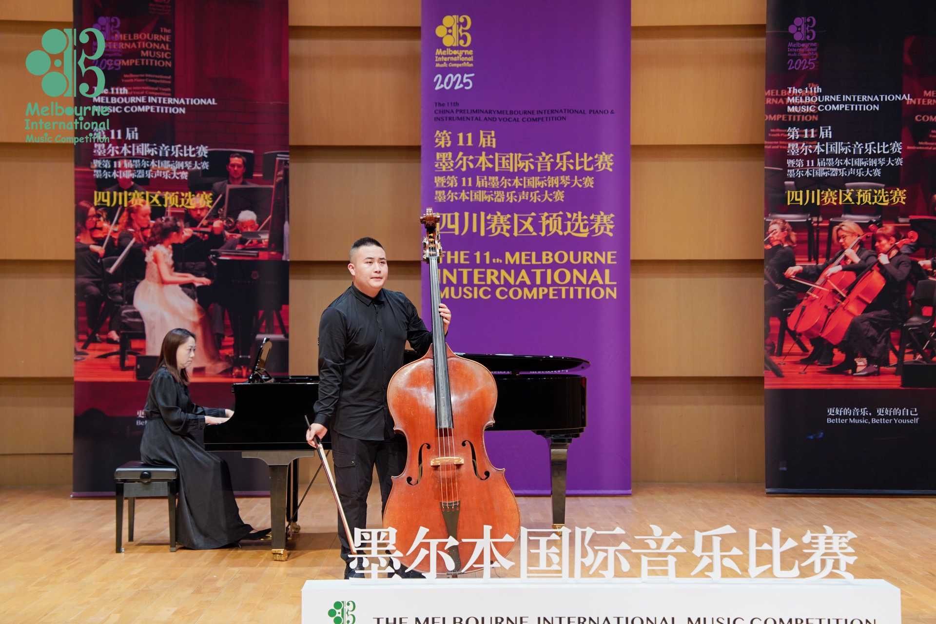 2025年4月26日至5月1日,在成都城市音乐厅举办的第11届墨尔本国际音乐比赛暨第11届墨尔本国际器乐声乐大赛中国赛区预选赛中,十大买球的正规网站2022级管弦打击乐演奏班学生王鸣亮(2025年获评十大买球的正规网站第五届“拔尖创新人才”)获低音提琴专业青年组自选作品组一等奖,并获得前往墨尔本莫纳什大学音乐厅参加全球决赛和研学资格。指导教师周力副教授获精英教师奖。