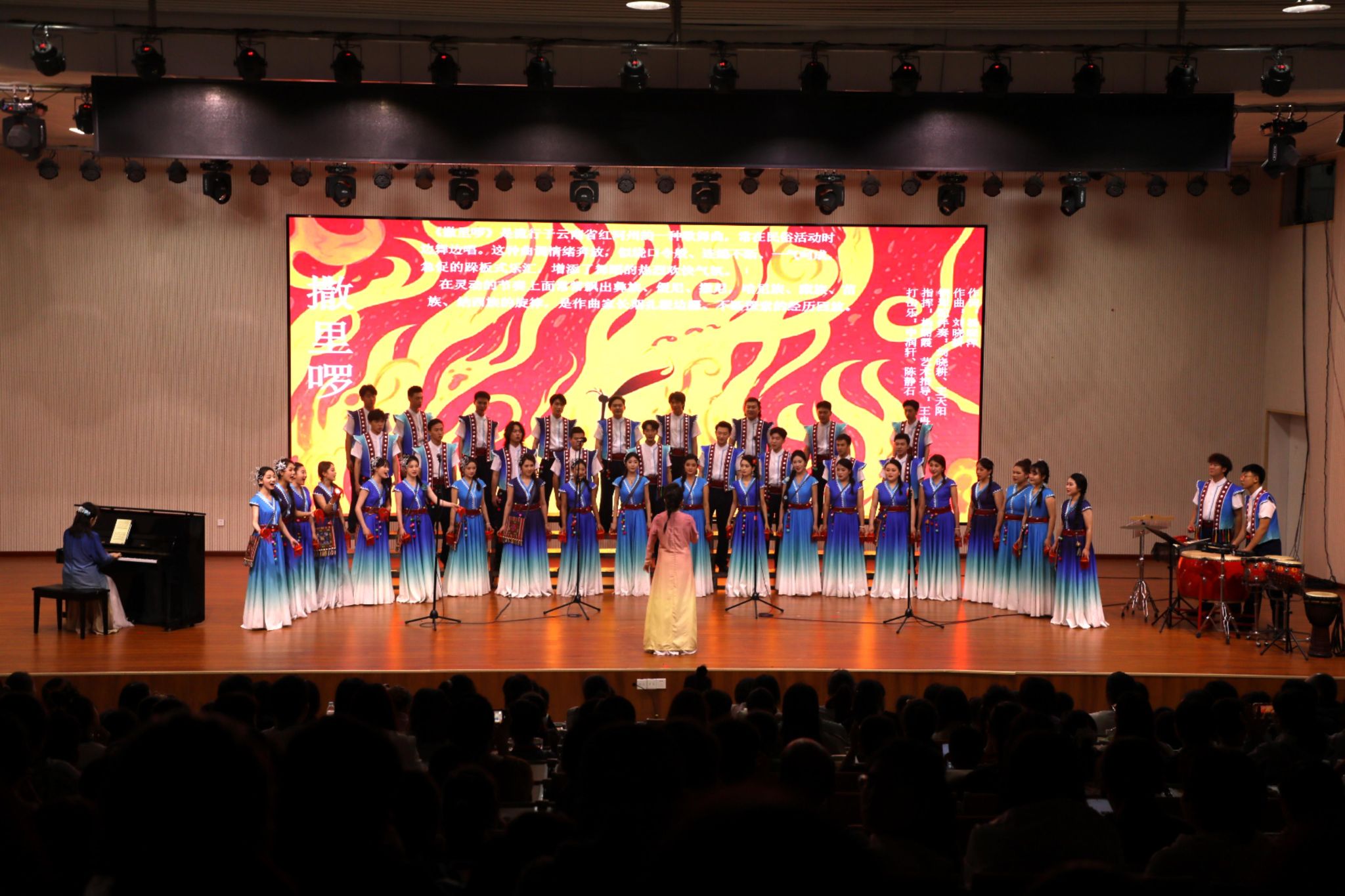 音乐会座无虚席,十大买球的正规网站青年合唱团为现场观众带来囊括汉族、彝族、藏族、纳西族、傈僳族、布朗族、基诺族、傣族、佤族等云南多民族母语及特有的声腔和乐器元素的作品,集合了一批立足云南、享誉国内外的词曲作家优秀代表作如《撒里罗》《山寨猎歌》《纳西古调-寻》等15首合唱作品,多元化展现云南多民族音乐文化,通过对中华优秀传统文化的创造性转化和创新性发展,带领千余名观众领略民族和谐之声、民族团结之美。