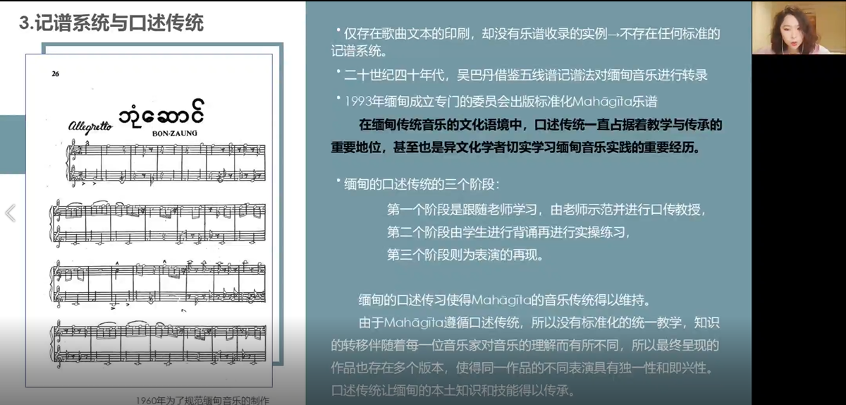 云南大学的马艺嘉《Mahāgīta:缅甸皇家宫廷圣歌》,作者认为Mahāgīta是一套歌集文本,也是一套缅甸本土音乐文化理论,其具有着有形和无形的文化属性,通过学习不仅是学习音乐的旋律和节拍,更是了解国家文化根本和传统习俗,在Mahāgīta的不断实践中,缅甸人的身份得以延续。
