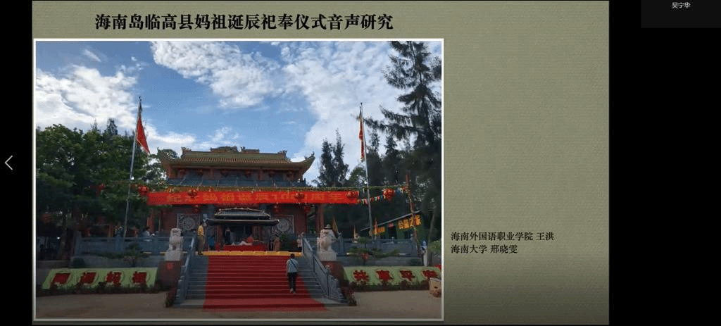 海南外国语职业学院王洪、邢晓雯的《海南岛临高县妈祖诞辰祀奉仪式音声研究》,对临高县的妈祖诞辰仪式实地调研,在会议上对妈祖仪式的具体流程进行了报告,提出希望能将海南妈祖音乐文化和海上丝绸之路沿线城市及国家进行跨区域的音乐文化交流的期望。