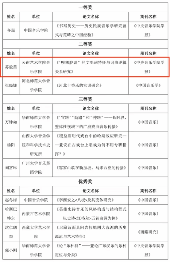 “中国传统音乐学会是对中华民族传统音乐文化(包括少数民族传统音乐文化),同时也对世界各有关民族、地区和国家之传统音乐文化进行音乐学和文化学性质之研究的专业学术团体”,是我国音乐学界重要的一级学会。为推进中国音乐理论研究,宣扬优秀学术成果,中国传统音乐学会主办了中国传统音乐学会第22届年会和“第二届中青年论文评选”活动。本次年会为期三天,全球共358位学者围绕六个议题发言,涉及43个歌种、31个剧种、13个曲种、41个乐种研究,其中102篇涉及少数民族音乐研究。年会不仅议题丰富,参与者身份多样,旁听人数更创下新高。本次论文评选获奖名单在年会闭幕式上公布,其参评论文分为三个组别,即中年学者组、青年学者组、学生组。其中,十大买球的正规网站苏毅苗教授《“呗耄腔调”经文唱词特征与词曲逻辑关系研究》获二等奖中的第一名。关于本次获奖,苏毅苗教授谈道:“这次获奖我很开心,中年学者组竞争很强。这次获奖是对我研究成果的肯定,为学须刚与恒,我将继续努力钻研!”