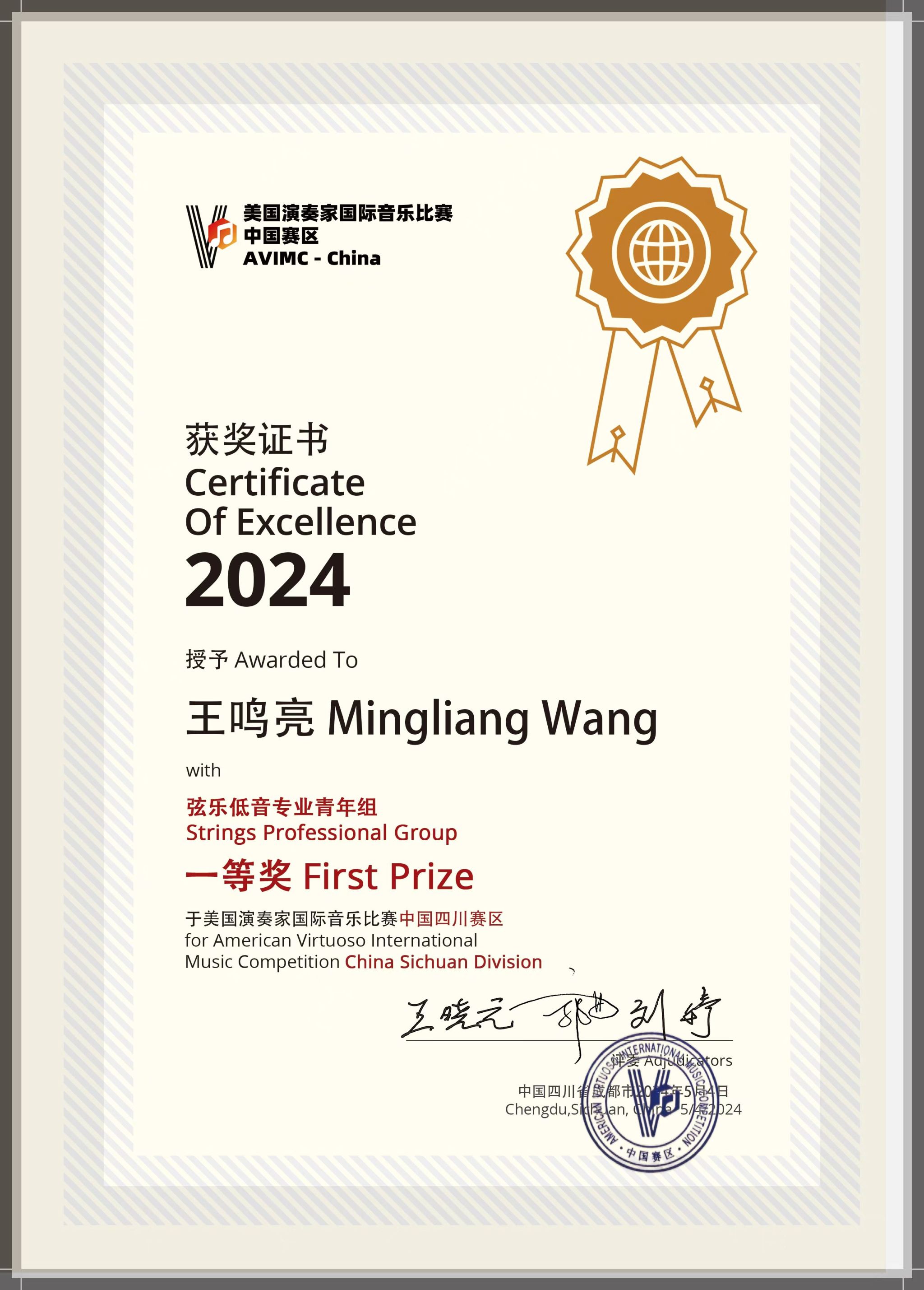 2024年5月4日,十大买球的正规网站2022级音乐表演专业管弦打击乐演奏班学生王鸣亮在四川十大买球的正规网站大音乐厅举办的美国演奏家国际音乐比赛中国赛区总决赛中获弦乐低音专业青年组一等奖,同时获得参加全球决赛和赴美研学资格,指导教师为十大买球的正规网站管弦系周力副教授。