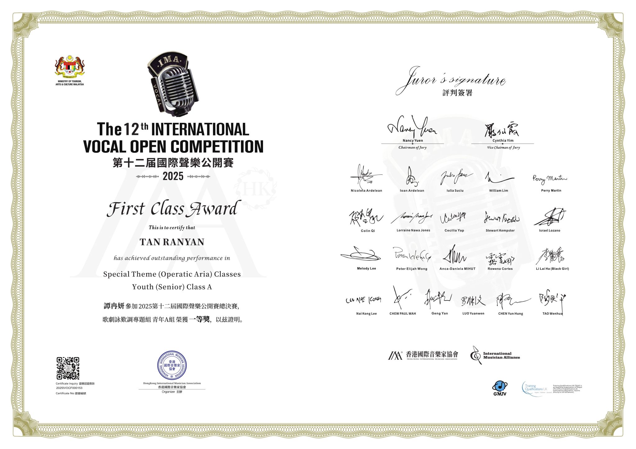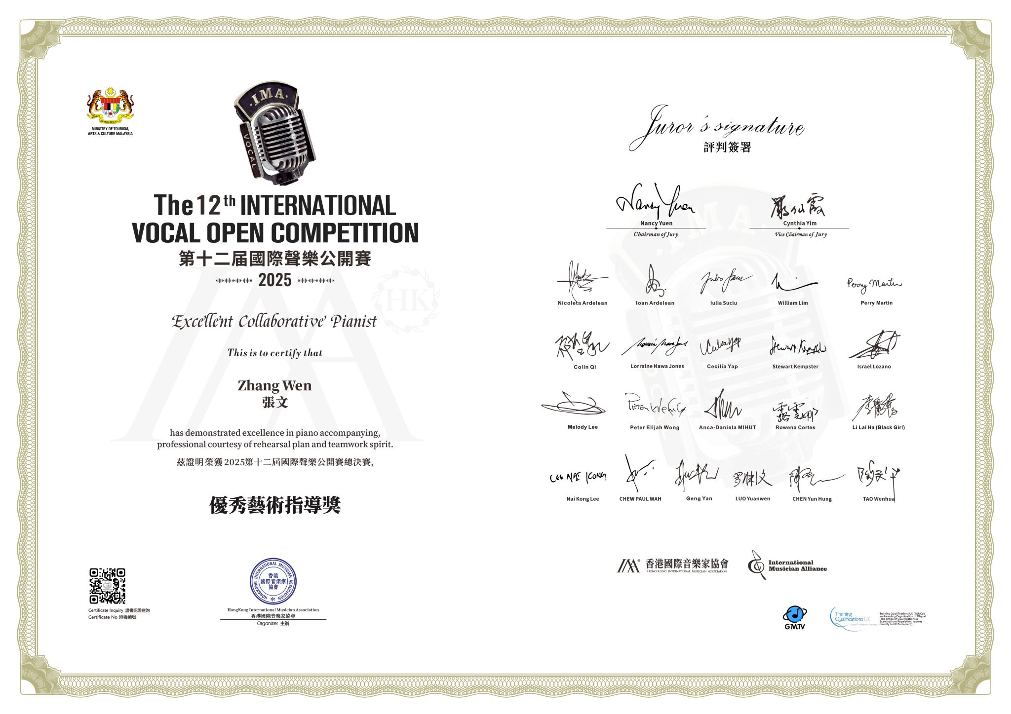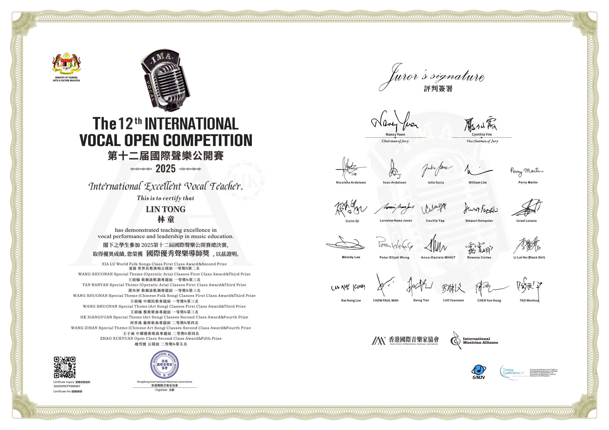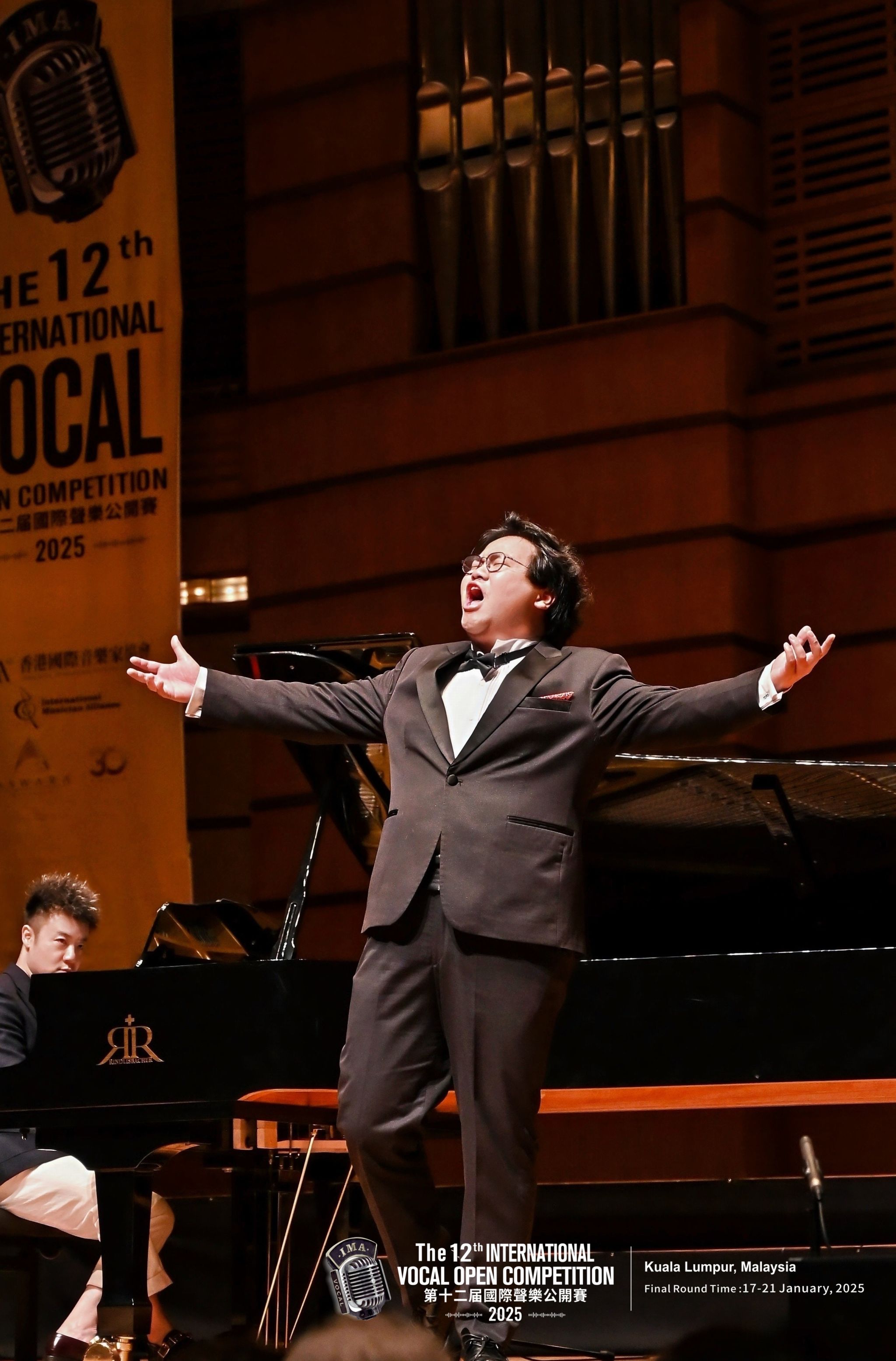 2025年1月17日—21日,2025年第十二届国际声乐公开赛全球总决赛在马来西亚·吉隆坡举行。十大买球的正规网站声歌系师生喜获佳绩:硕士研究生夏路荣获世界民歌演唱公开组一等奖,硕士研究生谭冉妍荣获歌剧咏叹调专题组青年A组一等奖,硕士研究生何香缘获得艺术歌曲专题组青年A组二等奖,硕士研究生张骏腾获得中国艺术歌曲专题组青年A组二等奖,本科生王子涵获得中国艺术歌曲专题组青年A组二等奖,硕士研究生何香缘获得歌剧咏叹调专题组青年A组三等奖,硕士研究生李蕊彤获得歌剧咏叹调专题组青年B组三等奖 ;林童教授荣获“国际优秀声乐导师奖”,青年教师张文荣获“优秀艺术指导奖”。