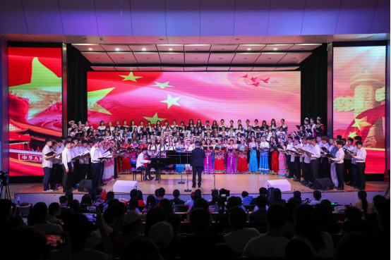 校党委黄雁玲书记与领导嘉宾应邀上台与师生共同唱响《没有共产党就没有新中国》等经典歌曲