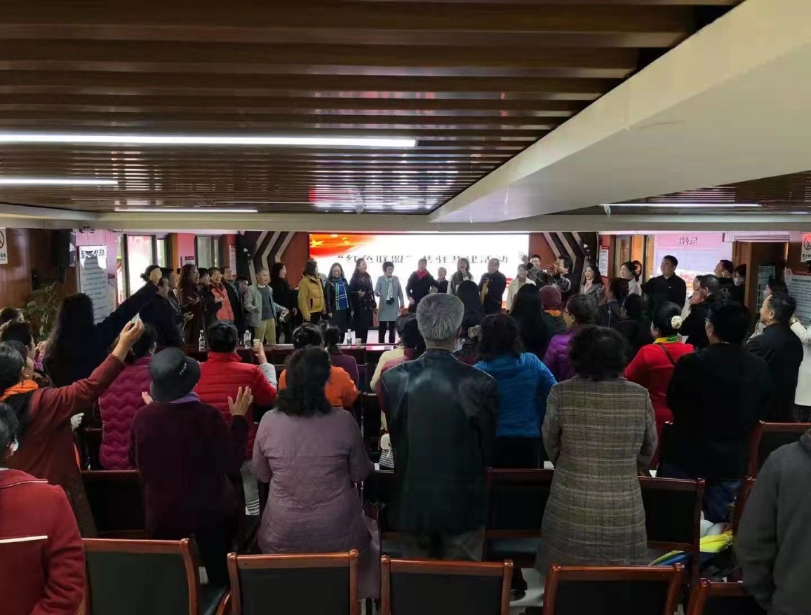 全体演员及参会教师党员与现场居民群众齐声共唱《我的祖国》、《我和我的祖国》