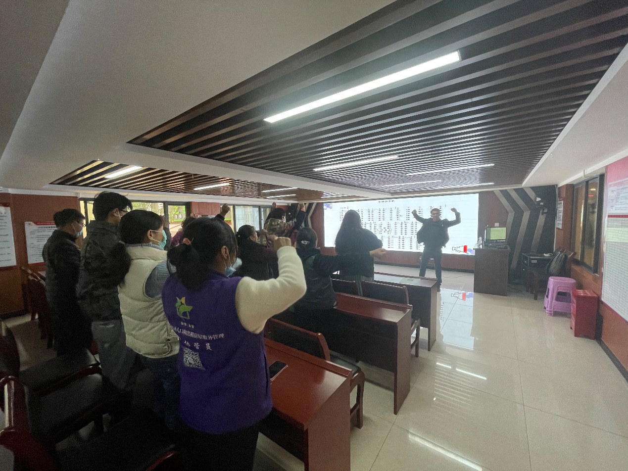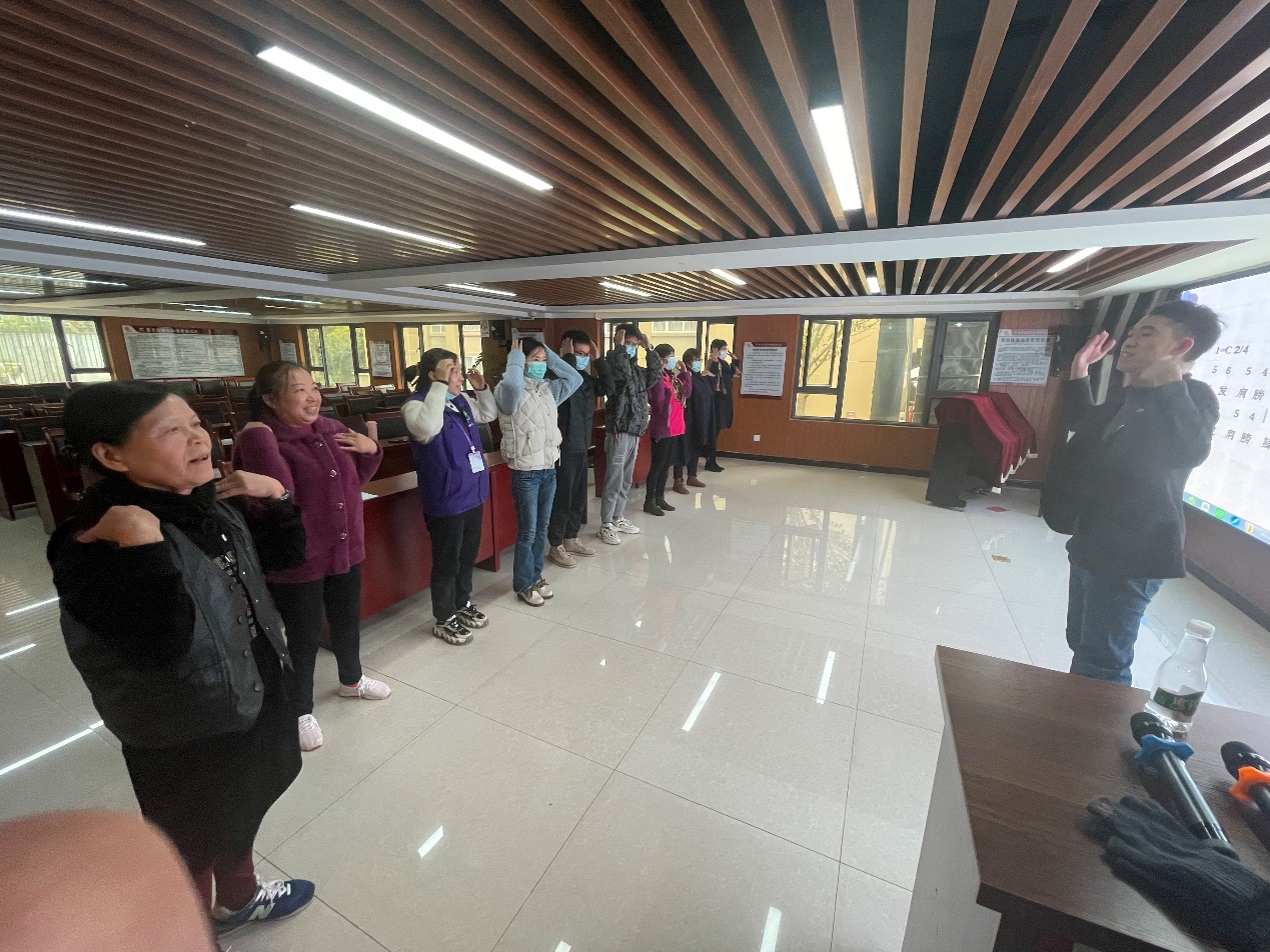 在讲座的最后,李老师带领大家现场进行了两段音乐治疗活动体验,选取了《幸福拍手歌》《头发肩膀膝盖脚》两首歌曲现场教唱,引导大家进行肢体活动,用理论结合实践的方式,使大家对音乐治疗有了进一步的了解,增添了更多的兴趣。讲座结束后,还有不少工作人员和群众跟李老师探讨更多音乐治疗知识,本次活动便在大家意犹未尽的气氛中圆满结束。