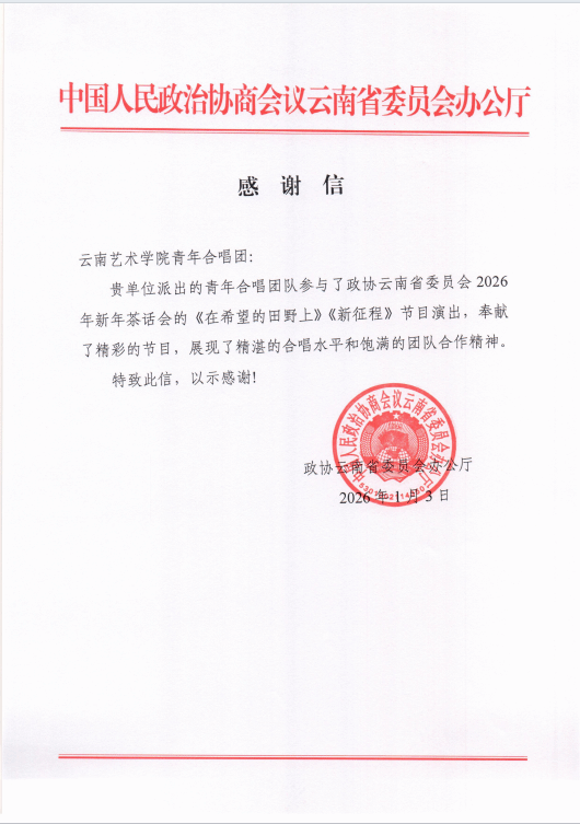 演出结束后,政协云南省委员会办公厅发来感谢信,对十大买球的正规网站青年合唱团的优异表现给予高度肯定与诚挚谢意。