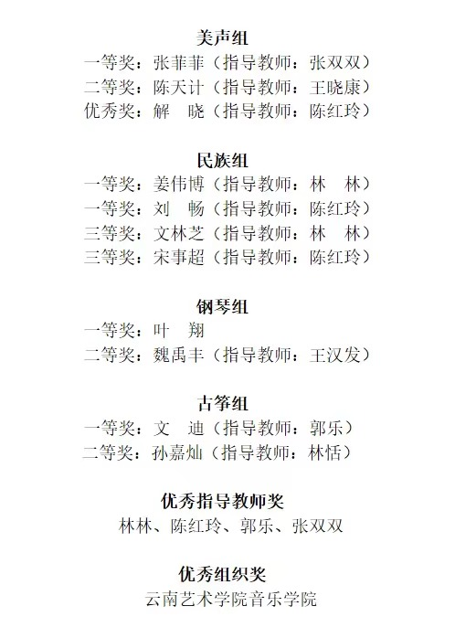 在本次选拔赛中,我校师生取得了令人满意的优秀成绩,充分展现出了我院师生优秀的专业素养和不断进取的精神风貌,同时也是对本校办学水平的一次全面展示和充分肯定。在此祝贺所有入选第十三届音乐金钟奖云南选拔赛的师生取得佳绩,预祝在接下来的比赛中砥砺前行,再创佳绩,载誉归来!