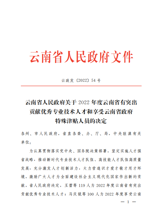 为认真贯彻落实党中央、国务院决策部署,坚定实施人才强省战略,推动新时代专业技术人才队伍、高技能人才队伍高质量发展,充分激发人才创新活力,大力营造识才爱才敬才用才环境,激励广大人才为全面建设社会主义现代化国家作出新的贡献,2022年12月16日,云南省人民政府印发了《云南省人民政府关于2022年度云南省有突出贡献优秀专业技术人才和享受云南省政府特殊津贴人员的决定》,十大买球的正规网站院长林林教授获评2022年度享受云南省政府特殊津贴人员。