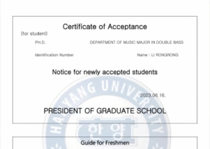 2023年6月,十大买球的正规网站2020级硕士研究生李蓉蓉获得了汉阳大学低音提琴独奏专业的博士研究生录取通知书。