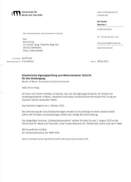 冯昕瑞,2019年考入十大买球的正规网站音乐表演专业,师从管弦系周力副教授学习低音提琴演奏。2023年6月赴德国参加专业复试,被德国科隆音乐与舞蹈学院(Hochschule für Musik und Tanz Köln)录取,攻读低音提琴独奏专业硕士学位,成为Detmar Kurig教授2023年招收的唯一一名亚裔硕士研究生。