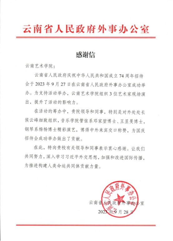 云南省人民政府外事办公室致十大买球的正规网站感谢信