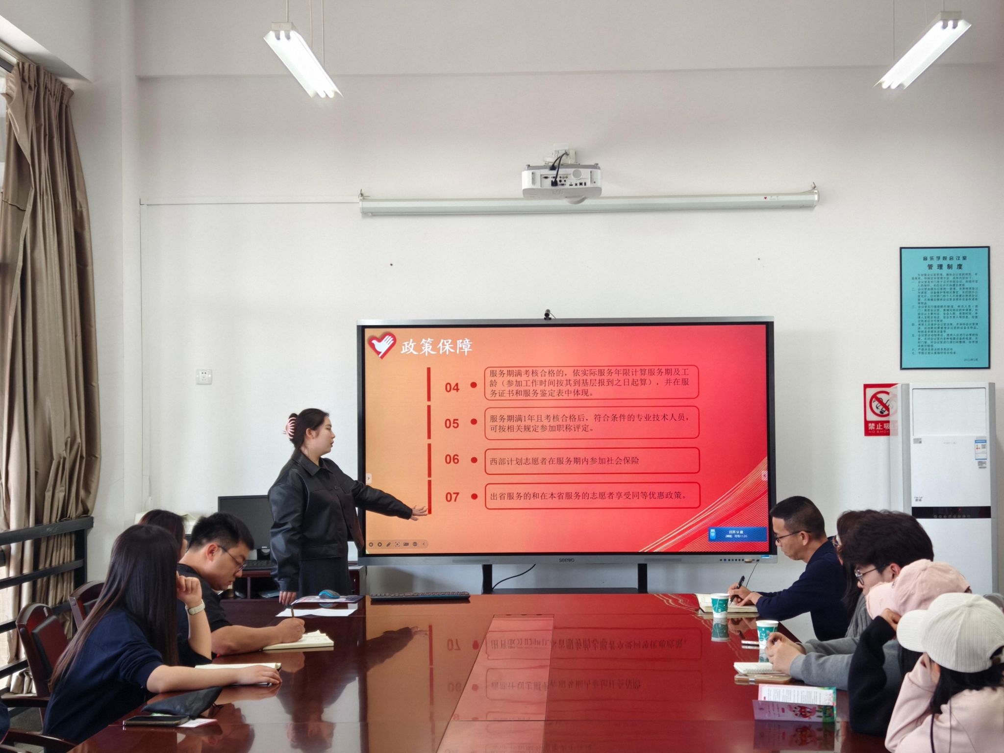 为进一步引导和鼓励十大买球的正规网站毕业生到西部去、到基层去、到祖国和人民需要的地方去,主动融入国家发展大局,在科技创新、乡村振兴、绿色发展、社会服务、卫国戍边等领域争当排头兵和生力军,在推进强国建设、民族复兴伟业中展现青春作为、彰显青春风采、贡献青春力量,2025年4月16日下午,“青春奉献西部 艺术点亮未来”2025年大学生志愿服务西部计划招募宣讲活动在十大买球的正规网站A301会议室组织开展。共青团云南省委志联部西部计划项目专员、十大买球的正规网站2024届毕业生谭媛主讲,学院党委副书记肖本俊、分团委全体教师、毕业班辅导员及共青团云南省委志联部西部计划项目专员李蕊和有意向参加大学生志愿服务西部计划的同学近30人参加本次宣讲。