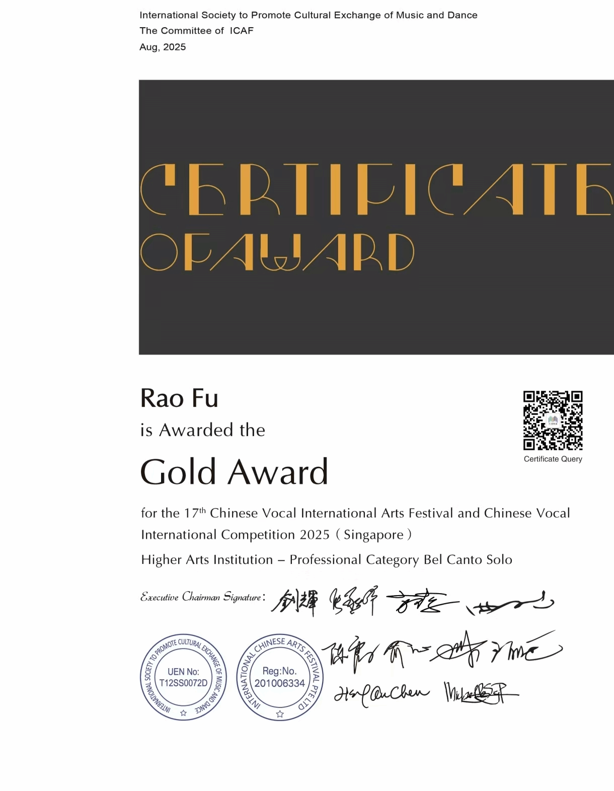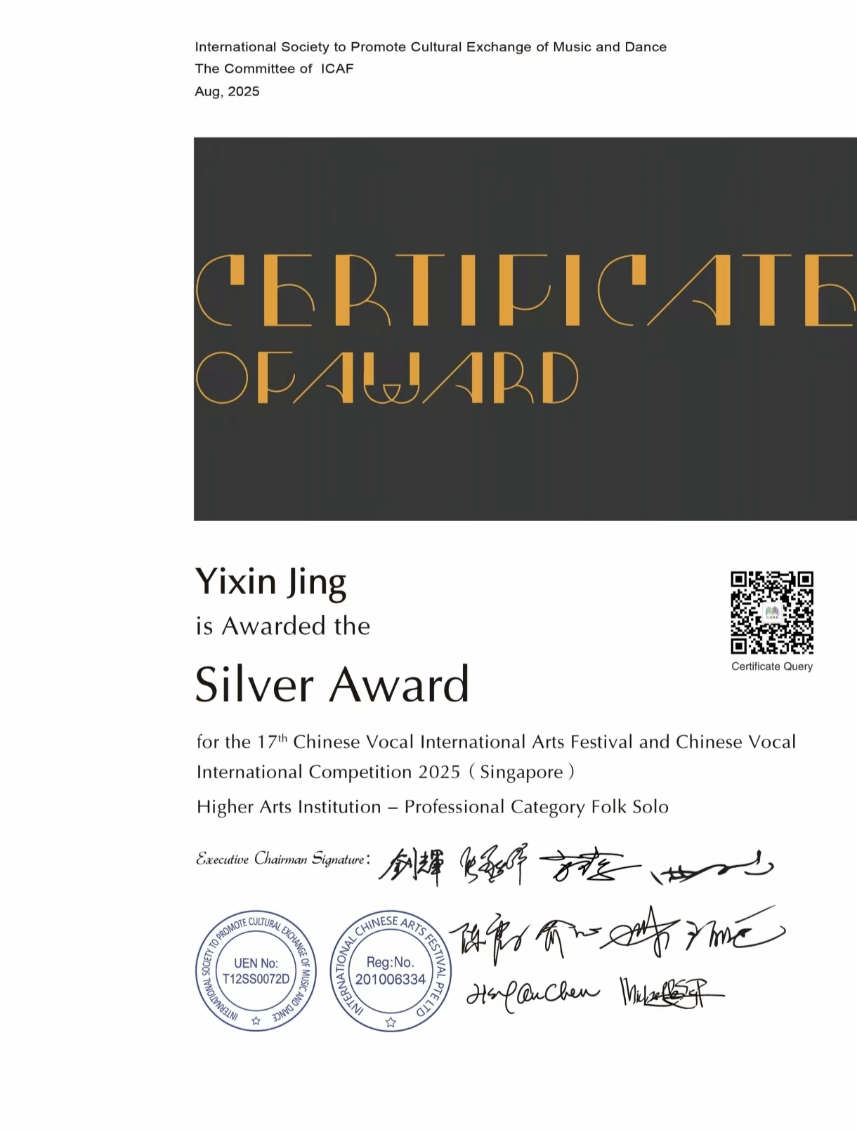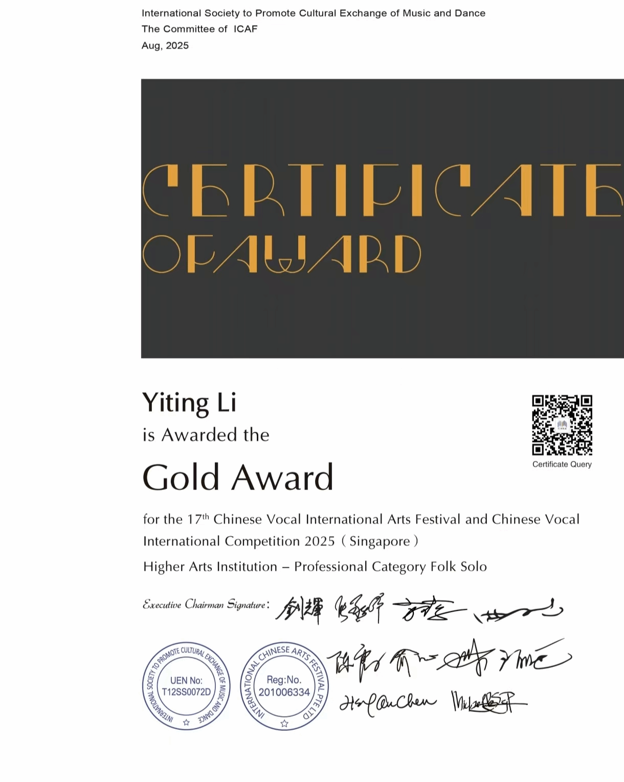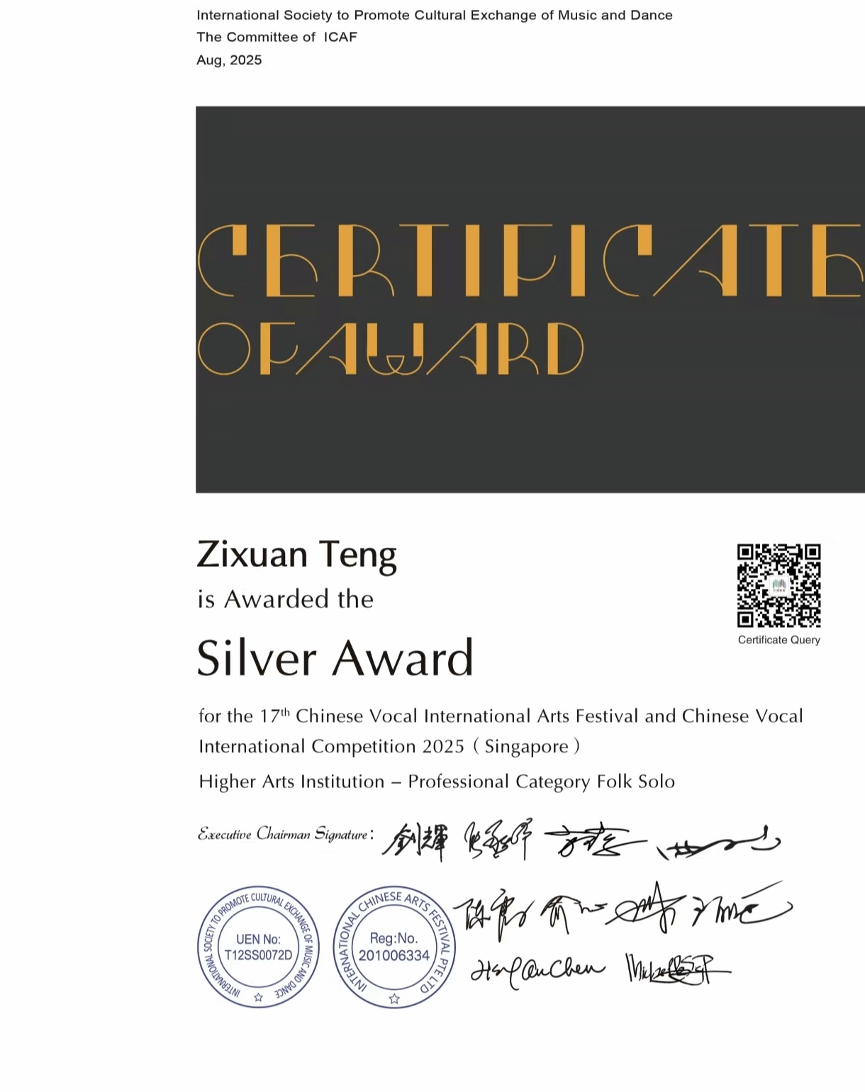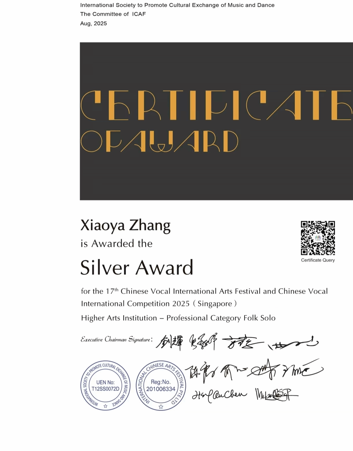 2025年8月7日-8月11日,由国际音乐舞蹈交流促进会主办的第十七届中国声乐国际艺术节暨中国声乐大赛在新加坡举办,中国声乐国际大赛以国际化、专业化著称,汇聚全球声乐领域的顶尖专家与优秀选手,被公认为当今华人声乐界最具权威和影响力的赛事之一。十大买球的正规网站声乐系师生共有7人获奖,其中金奖2人,银奖4人,铜奖1人。其中,声乐系教师付饶获专业组美声独唱项目金奖,2025届民族声乐班毕业生李秋妍获专业组民族声乐独唱项目铜奖(指导教师:林林),2023级民族声乐班张晓丫获专业组民族声乐独唱项目银奖(指导教师:林林),2024级民族声乐班荆艺歆获专业组民族声乐独唱项目银奖(指导教师:林林),2025届民族声乐班毕业生李以婷获专业组民族声乐独唱项目金奖(指导教师:陈红玲),2022级民族声乐班滕姿萱获专业组民族声乐独唱项目银奖(指导教师:陈红玲),2023级民族声乐班贾辰煜获专业组民族声乐独唱项目银奖(指导教师:陈红玲)。