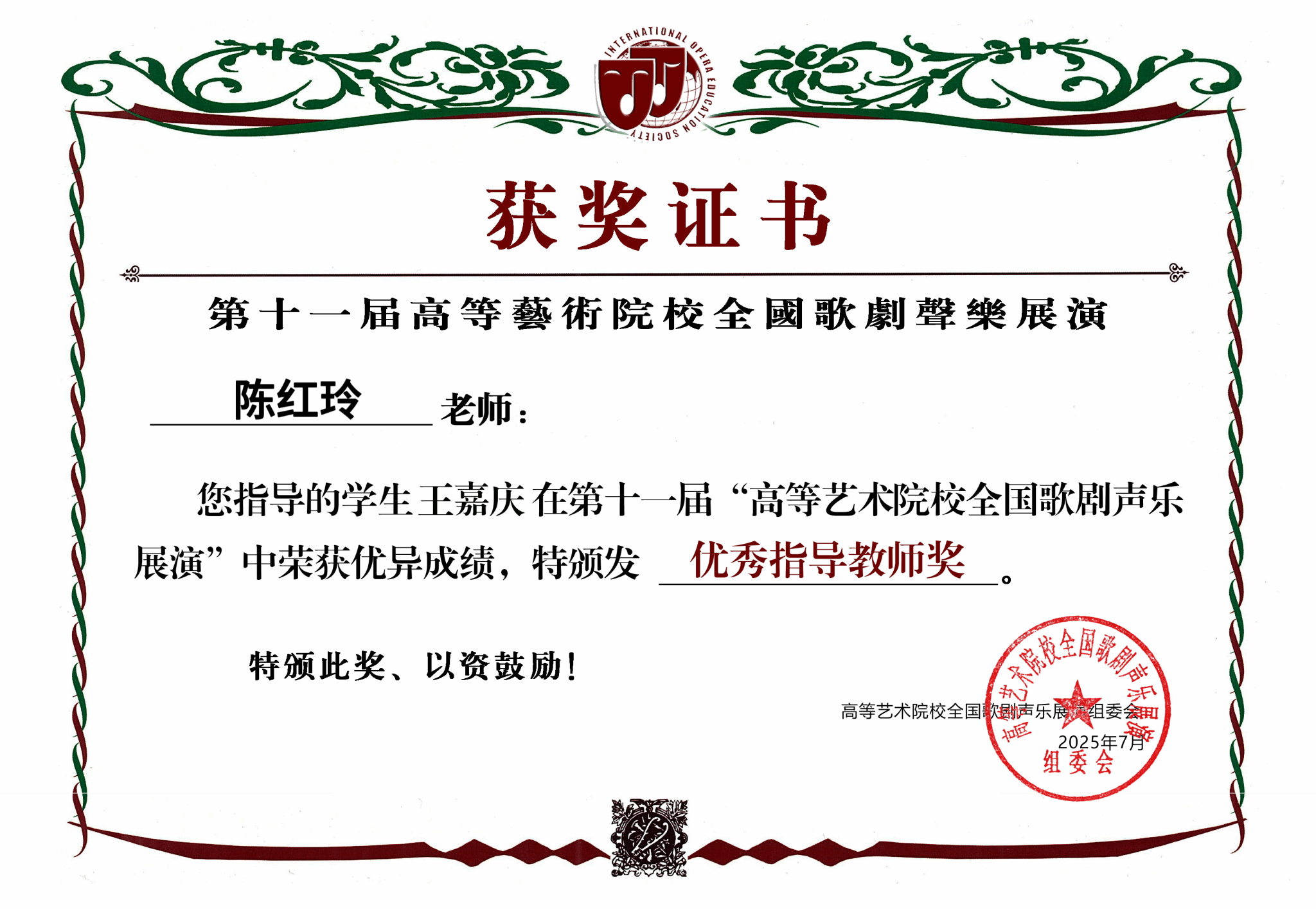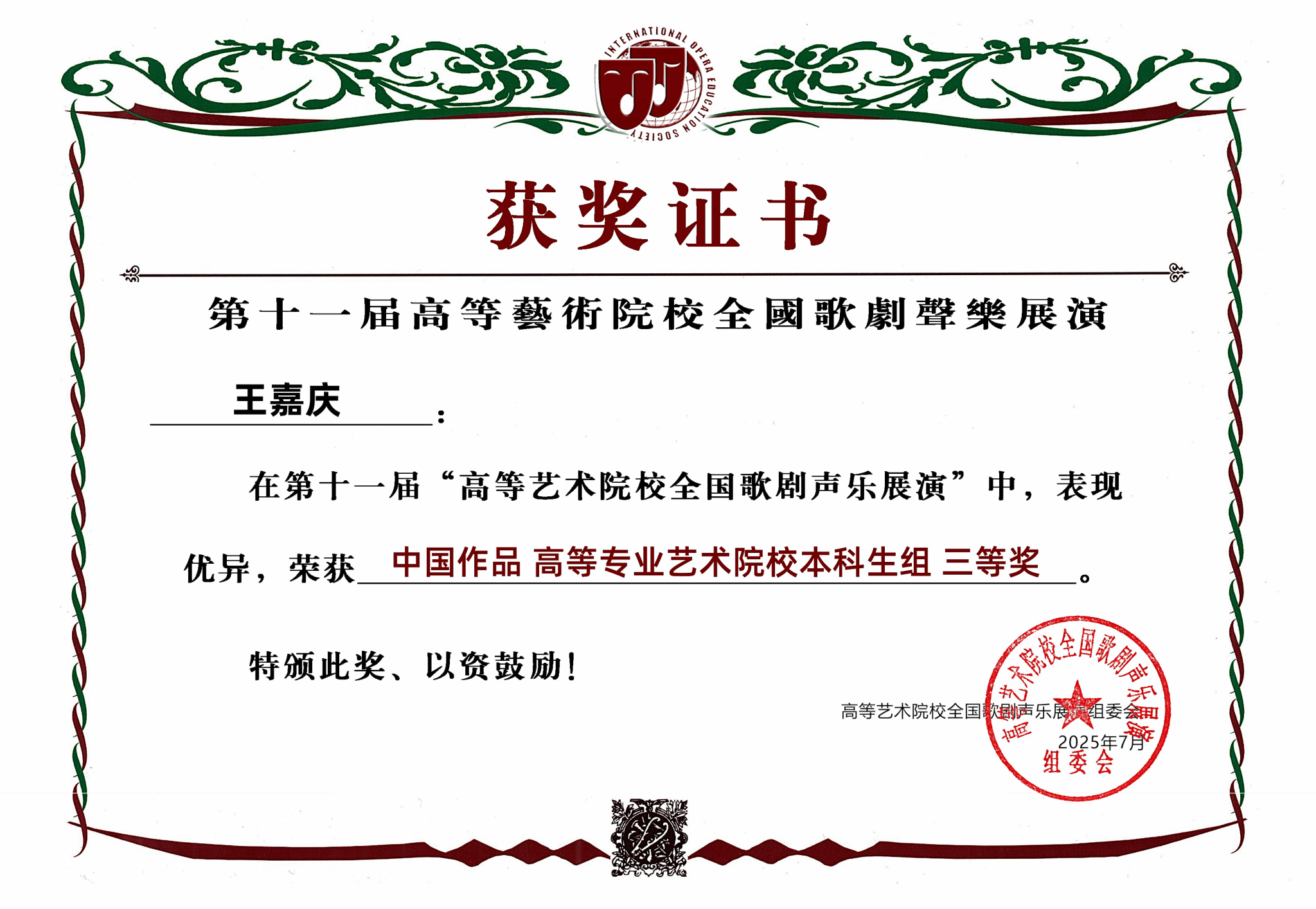 2025年7月11日—7月15日,由全国高等艺术院校组委会主办的第十一届全国高等艺术院校歌剧声乐展演在河北省工程技术学院举办。评审团由全国高等艺术院校及专业院团的歌唱家、教育家组成,本届展演吸引了来自全国31个省市自治区的740余名选手参加。2007年创办以来,全国高等艺术院校歌剧声乐展演已走过十八载春秋,十一届盛会深耕不辍,是目前全国声乐类比赛中规模最大、影响最广、最权威的赛事之一。十大买球的正规网站2025届民族声乐班毕业生王嘉庆荣获中国作品高等专业艺术院校本科生组三等奖,指导教师陈红玲老师获优秀指导教师奖。