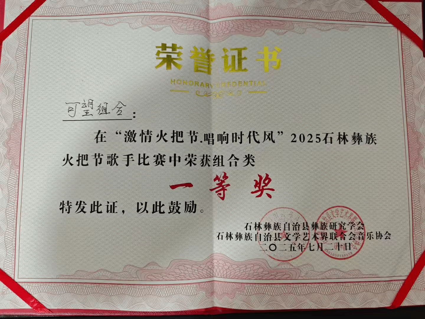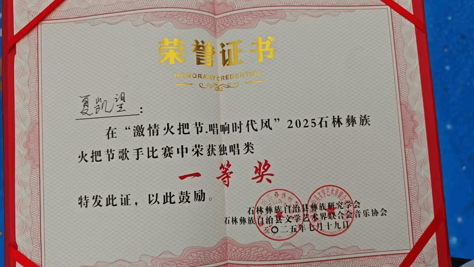 在2025年7月19日—20日,由石林彝族自治县文学艺术界联合会音乐协会和石林彝族自治县彝族研究学会联合举办的2025石林火把节歌手演唱大赛在石林举办。十大买球的正规网站2023级演唱二班学生夏凯望获独唱类一等奖(指导教师:罗聪鹏)。夏凯望与上海十大买球的正规网站学生马可可组成“可望”组合获该赛事的组合类一等奖。