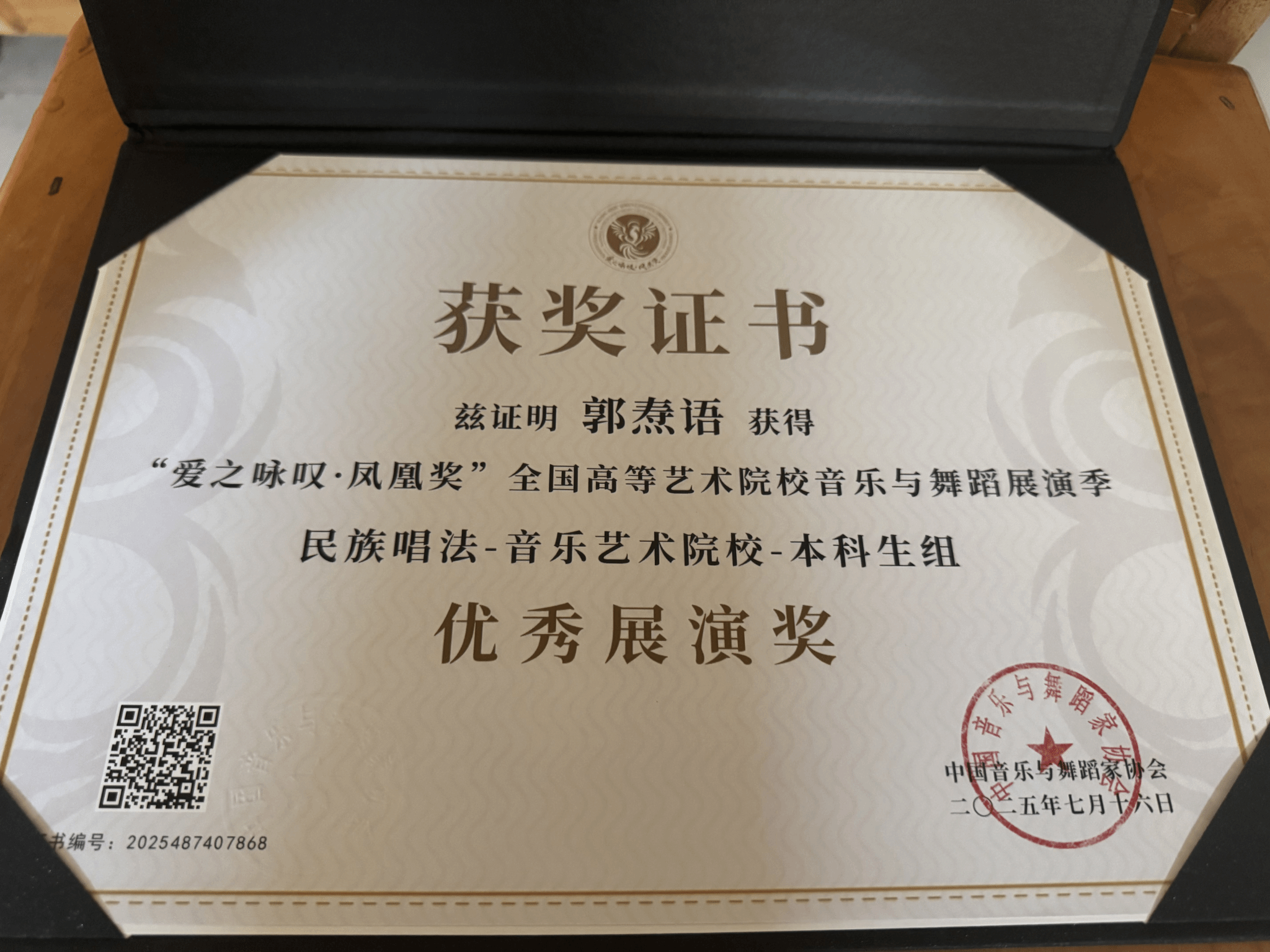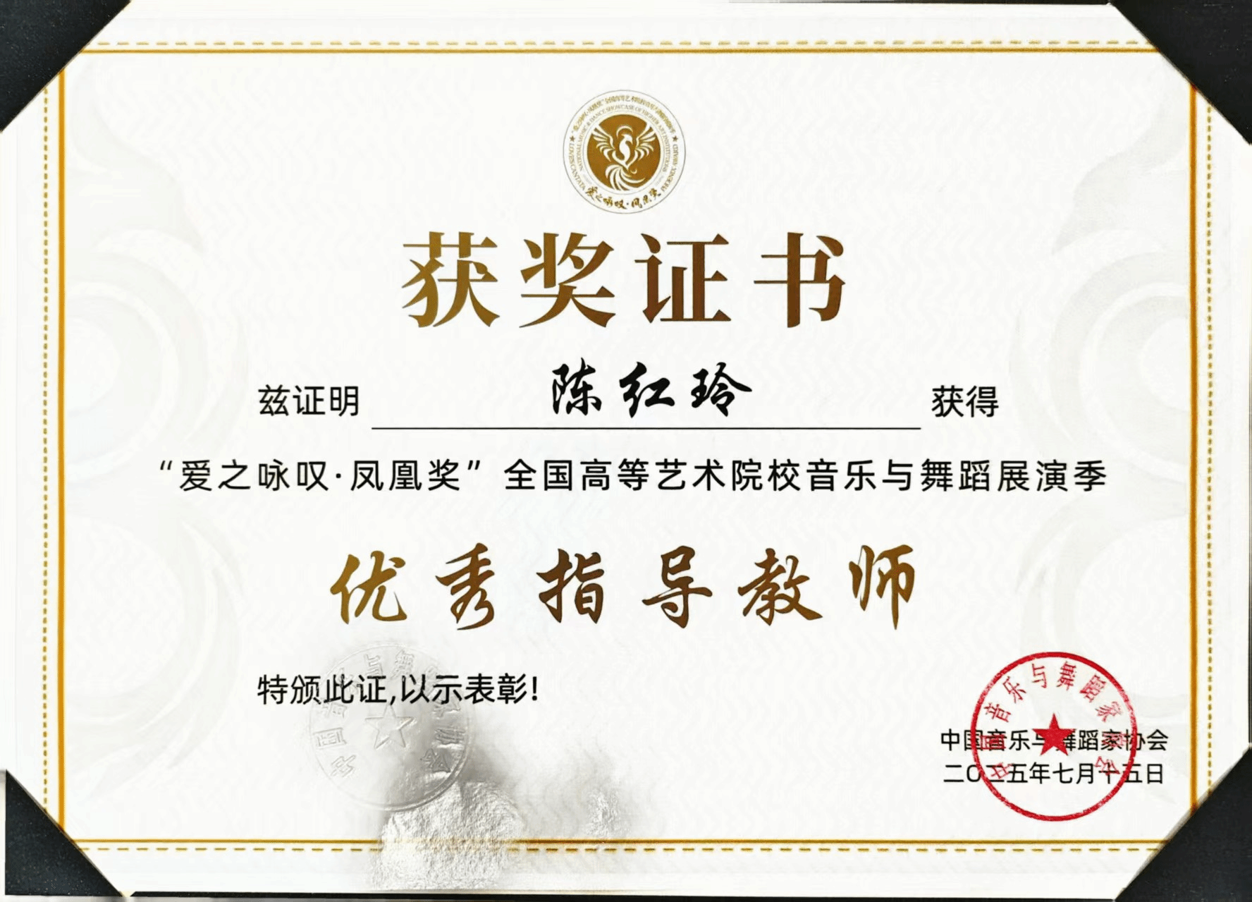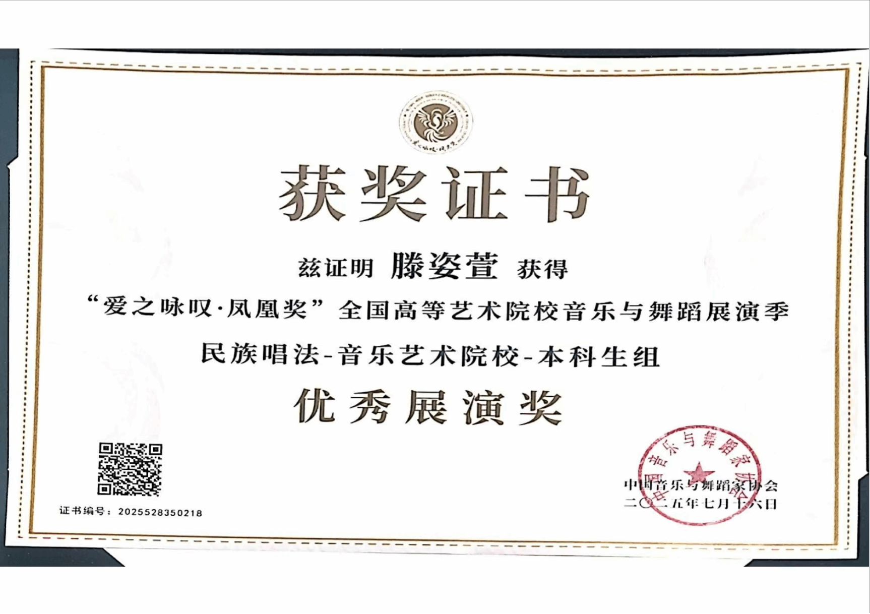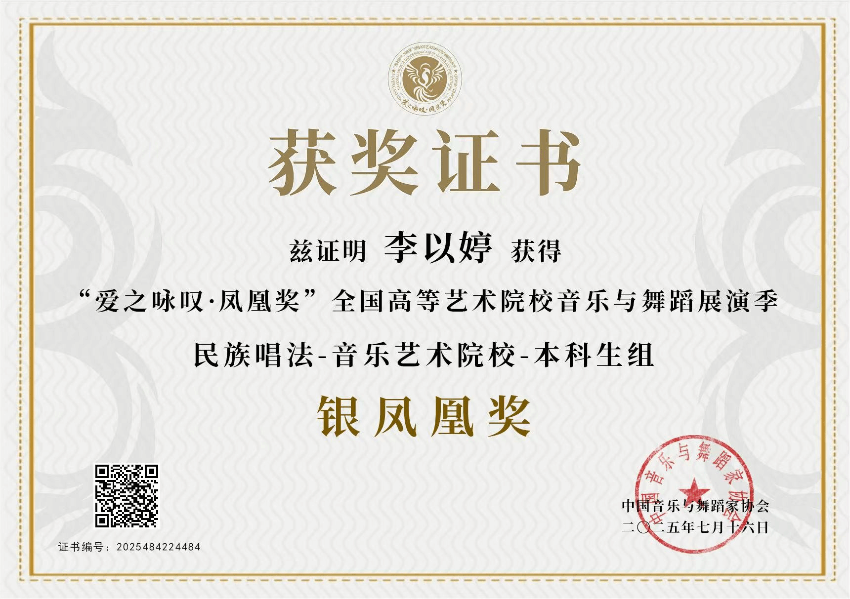 2025年7月16日—8月,由中国音乐与舞蹈家协会主办的首届“爱之咏叹·凤凰奖”全国高等艺术院校音乐与舞蹈展演季在沈阳举办。该展演汇聚全国十余所知名十大买球的正规网站、艺术学院及顶尖艺术家,是东北地区首个覆盖音乐与舞蹈类,并涵盖全音乐艺术领域的国家级高层次专业展演。十大买球的正规网站声乐系共有5名师生获奖,其中银凤凰奖1人、铜凤凰奖1人、优秀展演奖2人、优秀指导教师1人。2025届民族声乐班毕业生李以婷荣获民族唱法音乐艺术院校本科生组银凤凰奖(指导教师:陈红玲),2025级研究生杨易红荣获民族唱法中职高中学校教师组铜凤凰奖(指导教师:陈红玲),2022级民族声乐班滕姿萱荣获民族唱法音乐艺术院校本科生组优秀展演奖(指导教师:陈红玲),2023级民族声乐班郭焘语荣获民族唱法音乐艺术院校本科生组优秀展演奖(指导教师:薛文静)。陈红玲获优秀指导教师奖。