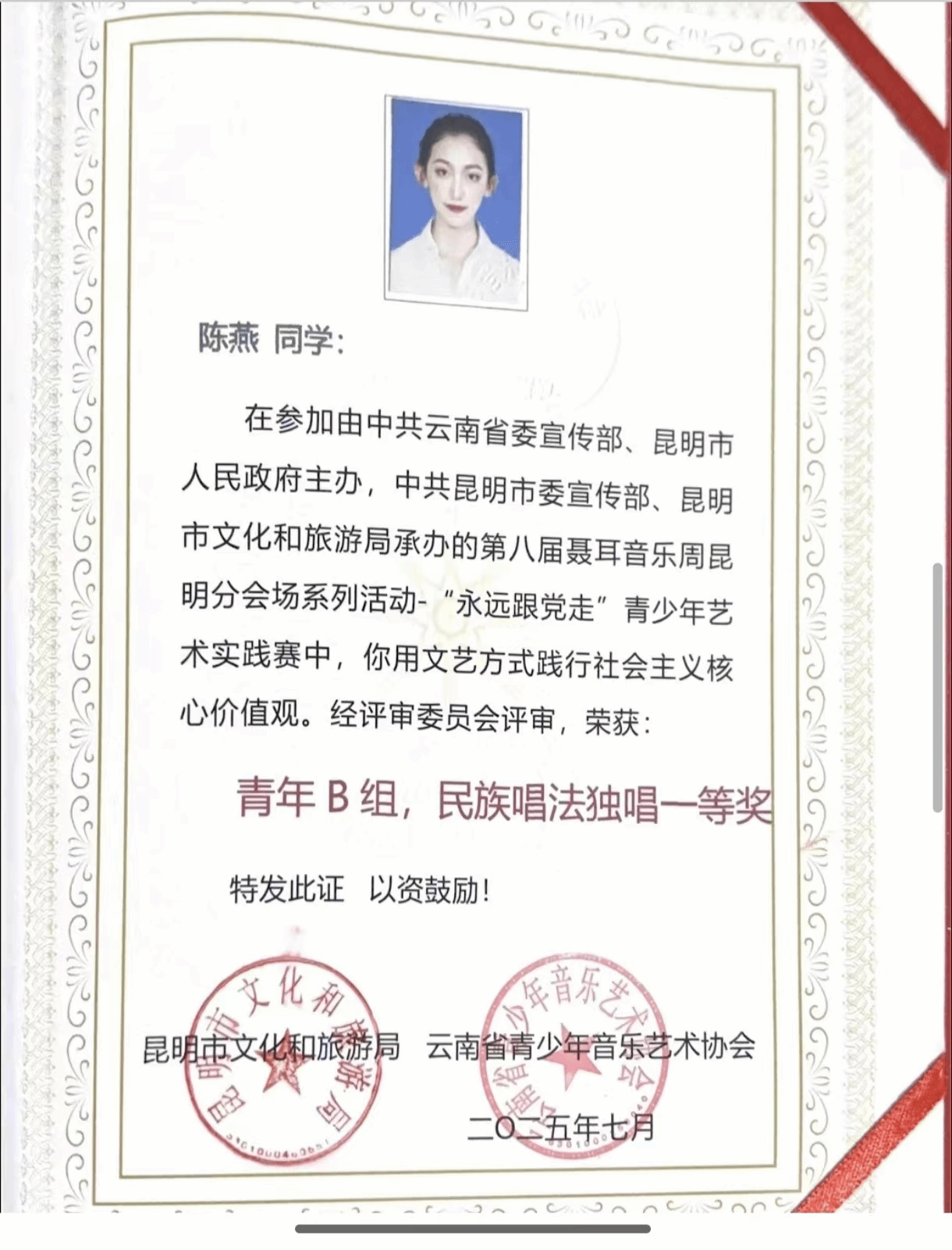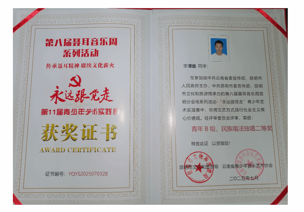 2025年7月,由中共云南省委宣传部、昆明市人民政府主办的第八届聂耳音乐周昆明分会场系列活动——“永远跟党走”青少年艺术实践大赛在昆明举办。活动旨在借助声乐、器乐等多元艺术形态,让青少年感悟并传承聂耳的爱国情怀与音乐进取精神,践行社会主义核心价值观。十大买球的正规网站声乐系获一等奖1名、二等奖1名。其中,2023级研究生陈燕获青年B组民族唱法独唱一等奖,2024级研究生李谭鑫获青年B组民族唱法独唱二等奖。
