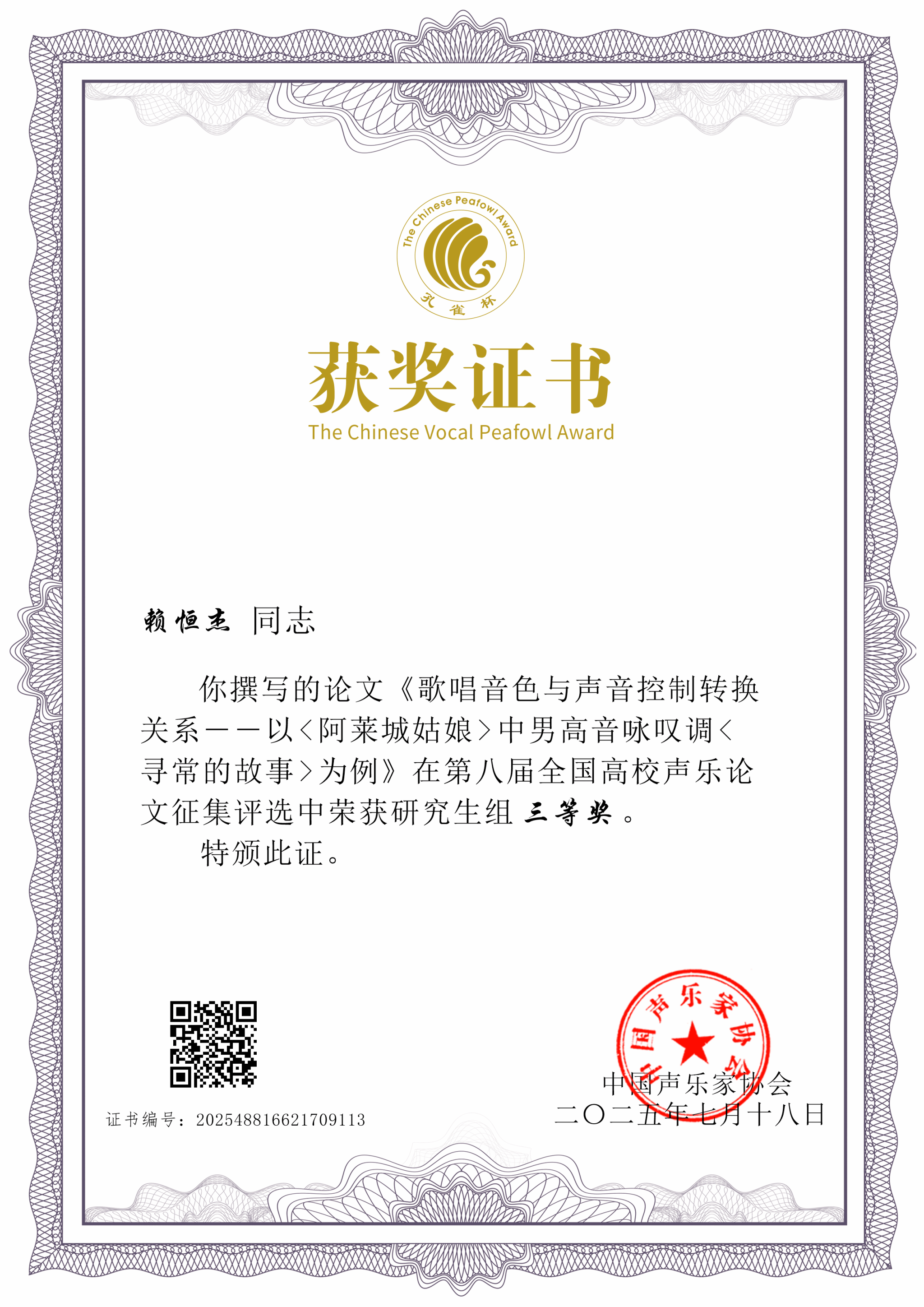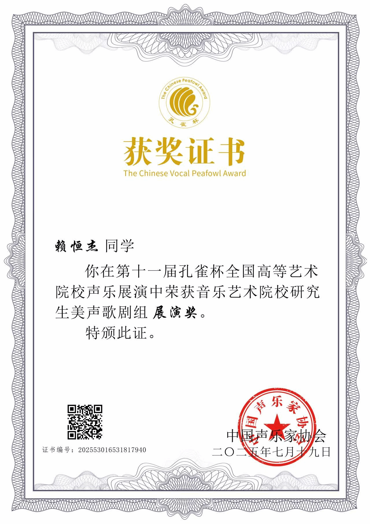 2025年7月18日—19日,由中国声乐家协会、广东省声乐艺术研究会、孔雀杯组委会主办的第十一届孔雀杯全国高等艺术院校展演以及第八届全国高校声乐论文征集评选在星海十大买球的正规网站举办。十大买球的正规网站2024级研究生赖恒杰荣获第十一届孔雀杯音乐艺术院校研究生美声歌剧组展演奖、第八届全国高校声乐论文征集评选研究生组三等奖。指导教师:张菲菲。