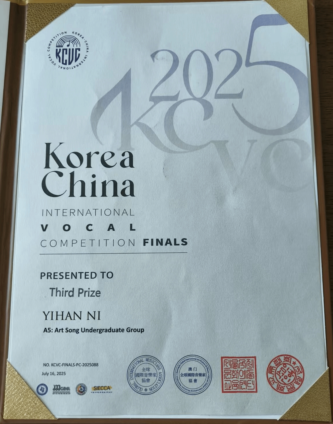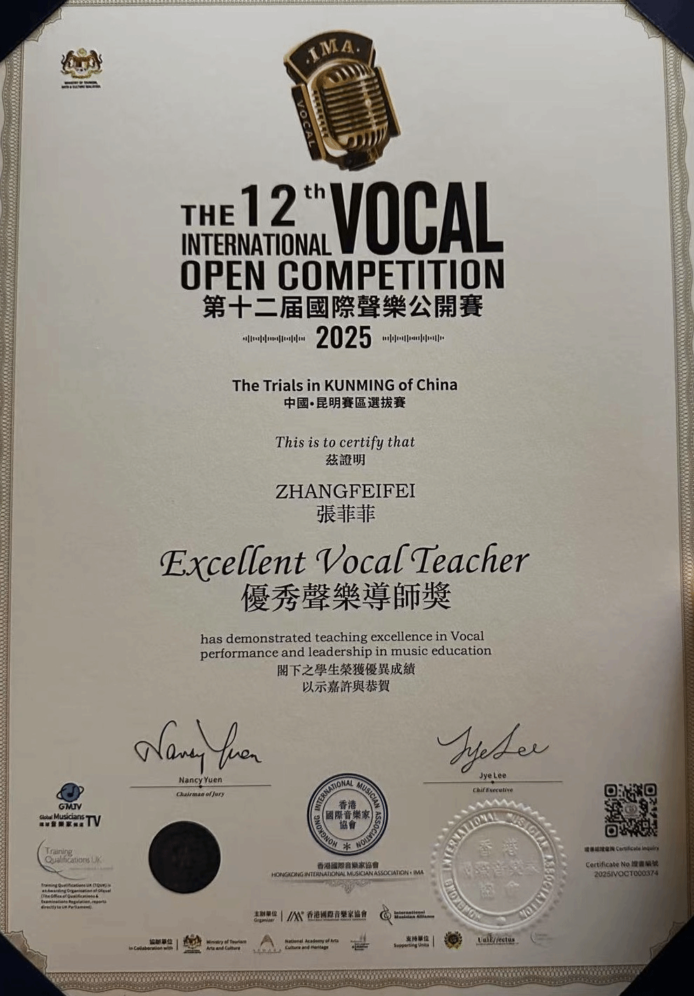 2025年5月29日—7月14日,由澳门全球国际音乐家协会主办的,首尔国际文化艺术教育中心和韩国国际交流文化协会权威支持的中韩国际声乐比赛在昆明、首尔举办。该比赛旨在搭建中韩乃至全球声乐人才的专业交流与展示平台,发掘并培养优秀声乐人才,深化中韩音乐文化交融。十大买球的正规网站2024级演唱一班学生倪一涵荣获云南昆明赛区中韩国际声乐比赛大学艺术歌曲组初赛一等奖、韩国首尔中韩国际声乐比赛大学艺术歌曲组决赛三等奖,张菲菲获优秀声乐导师奖。