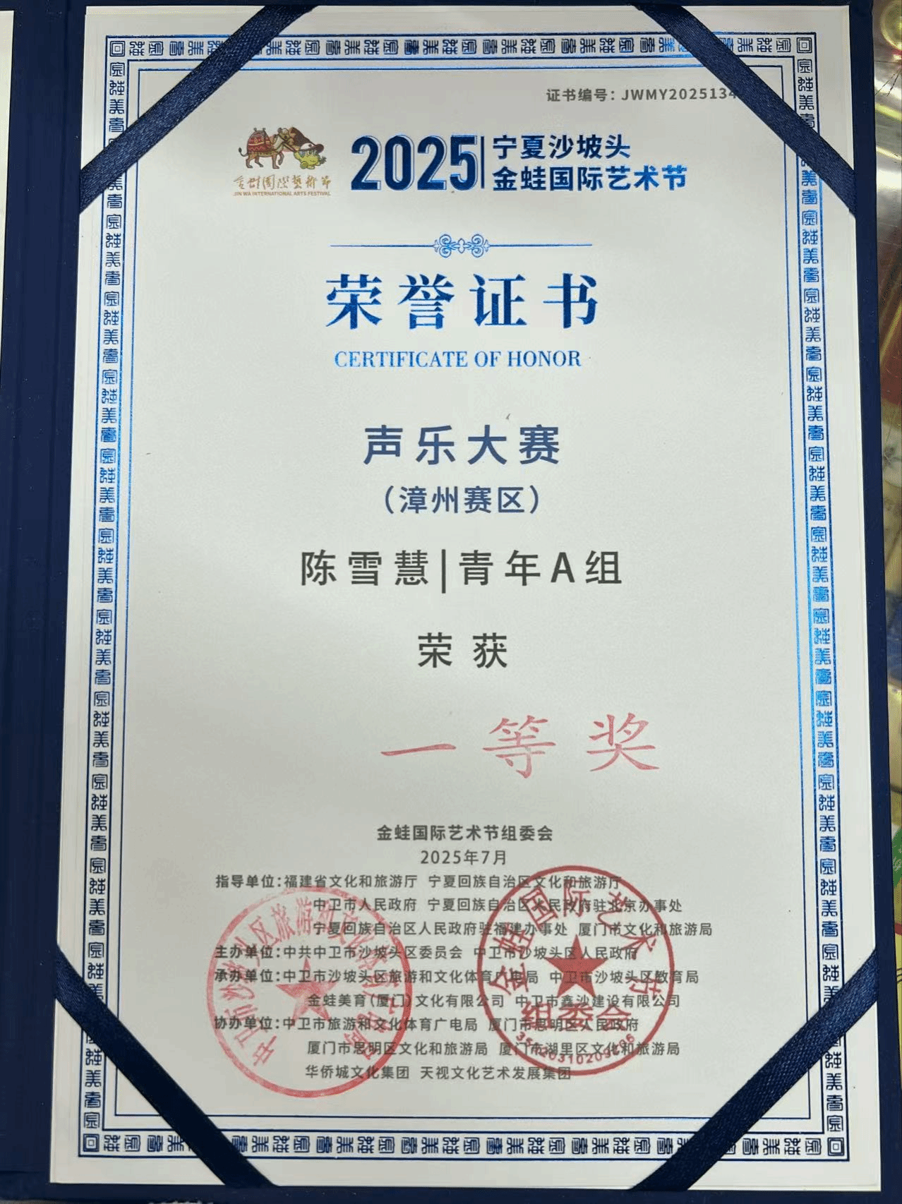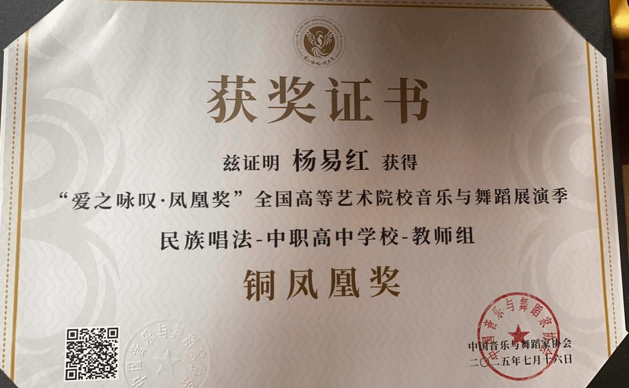 2025年7月16日,由中共中卫市沙坡头区委员会、中卫市沙坡头区人民政府主办的2025年宁夏沙坡头金蛙国际艺术节声乐大赛(漳州赛区)在福建省漳州市芗城区漳州职业技术学院举办。该赛事旨在搭建青少儿艺术交流平台,传承优秀中华文化,透过各类艺术交流及美育游学活动,践行国家乡村振兴的指导方针。十大买球的正规网站2024级民族声乐二班学生陈雪慧荣获漳州赛区青年A组一等奖。