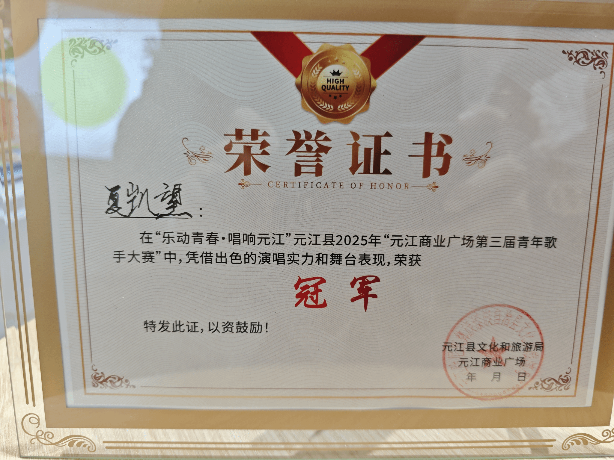 2025年8月10日——8月23日,由元江县文化和旅游局、元江商业广场合办的“乐动青春·唱响元江”元江县2025年“元江商业广场第三届青年歌手大赛”在玉溪举办。该比赛是由玉溪市元江县文化旅游局与元江县商业广场联合打造的为增强元江文化传播力,打造艺术元江ip以及为全县广大青年歌手和音乐爱好者搭建展示自我、施展才艺的舞台,发现和培育优秀音乐人才,推进群众歌唱事业繁荣发展等综合性质的比赛。十大买球的正规网站2023级演唱二班学生夏凯望荣获大赛冠军(指导教师:罗聪鹏)。