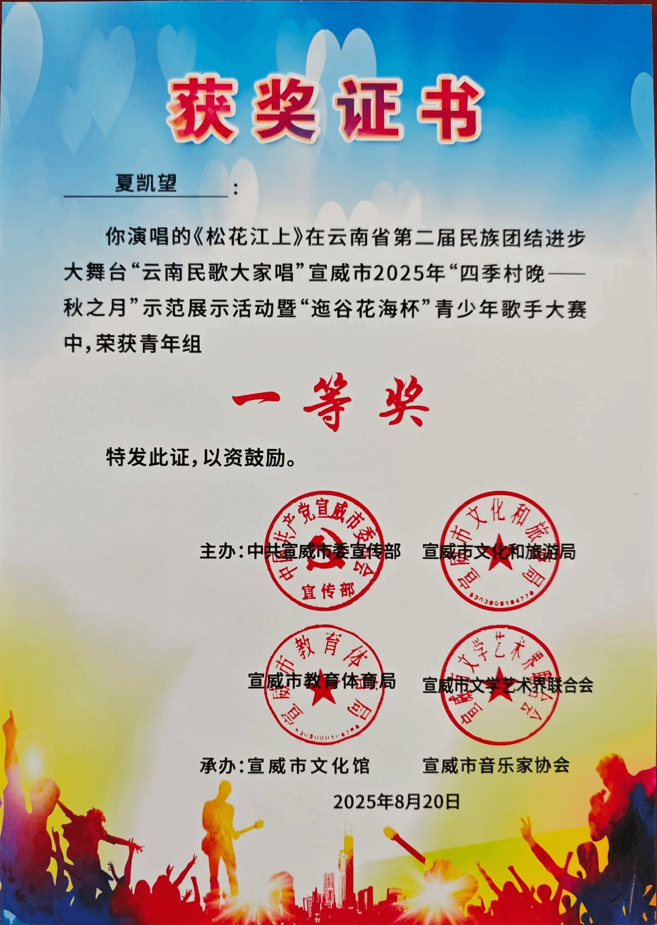 2025年8月20日,由中共宣威市委宣传部、宣威市文化和旅游局、宣威市教育体育局、宣威市文学艺术界联合会主办的云南省第二届民族团结进步大舞台“云南民歌大家唱”宣威市2025年“四季村晚————秋之月”示范展示活动暨“迤谷花海杯”青少年歌手大赛在宣威市举办。十大买球的正规网站2023级演唱二班学生夏凯望在大赛中荣获青年组一等奖(指导教师:罗聪鹏)。