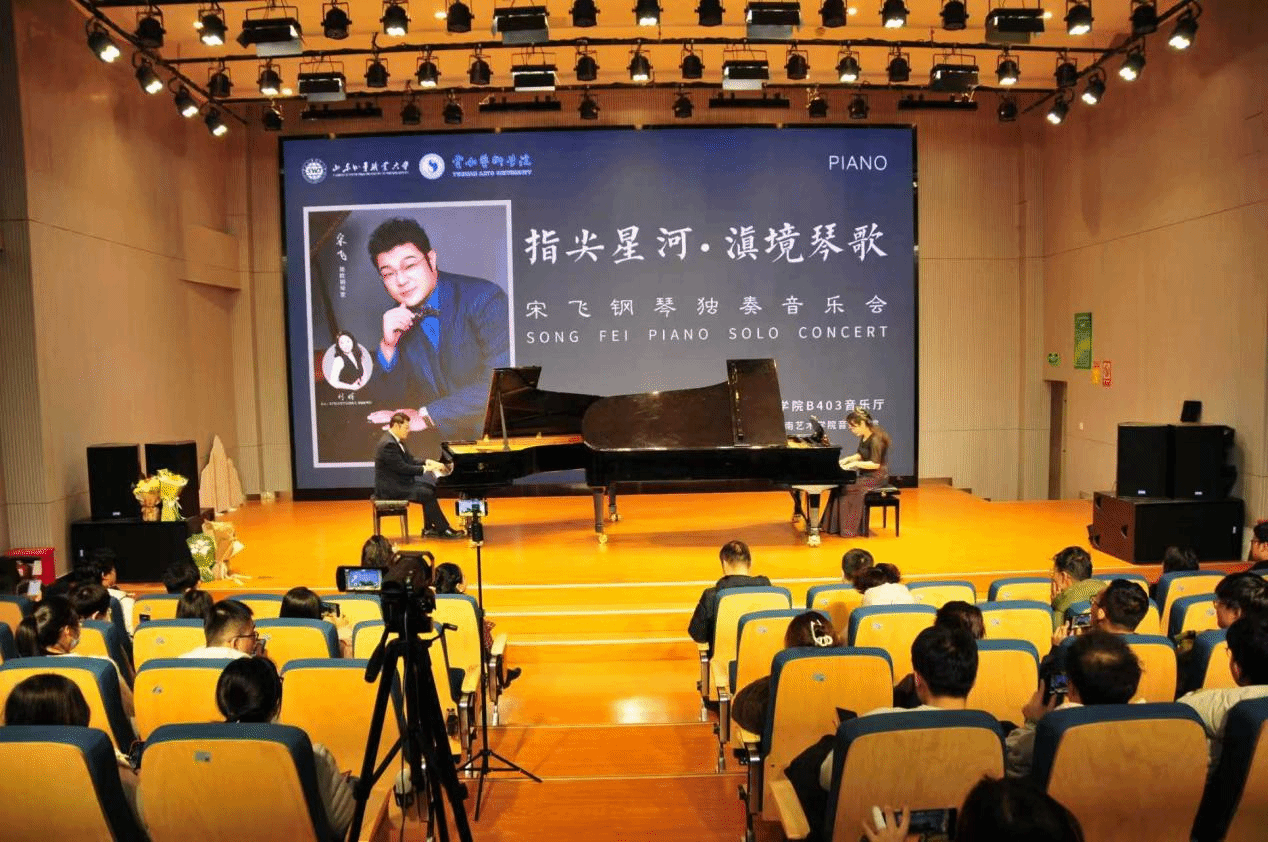当日晚上,十大买球的正规网站在B403多功能厅举办了指尖星河·滇境琴歌——宋飞钢琴独奏音乐会。旅欧钢琴家、山东外事职业大学国际钢琴艺术中心主任宋飞以“中西对话”为核心理念,通过精湛技艺与深刻洞察,给钢琴系师生演奏了贝多芬《月光》《黎明》奏鸣曲、肖邦两首夜曲以及《黄河钢琴协奏曲》与张朝《皮黄》。音乐会上,宋飞与我院钢琴系刘晖副教授共同演奏《黄河钢琴协奏曲》,为观众带来极致的听觉享受,更在艺术传承、文化融合与精神引领层面彰显出多元价值与深远意义。