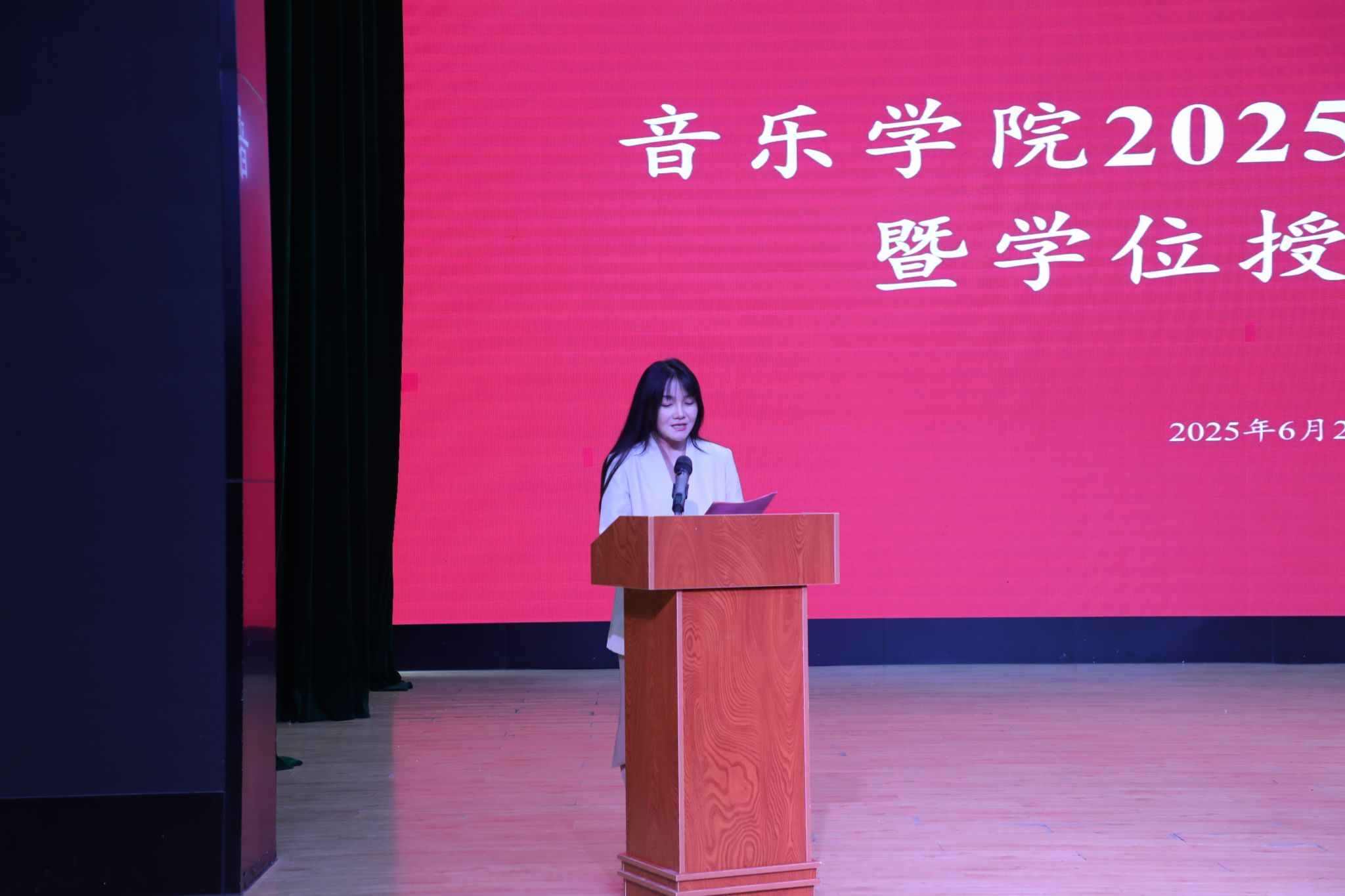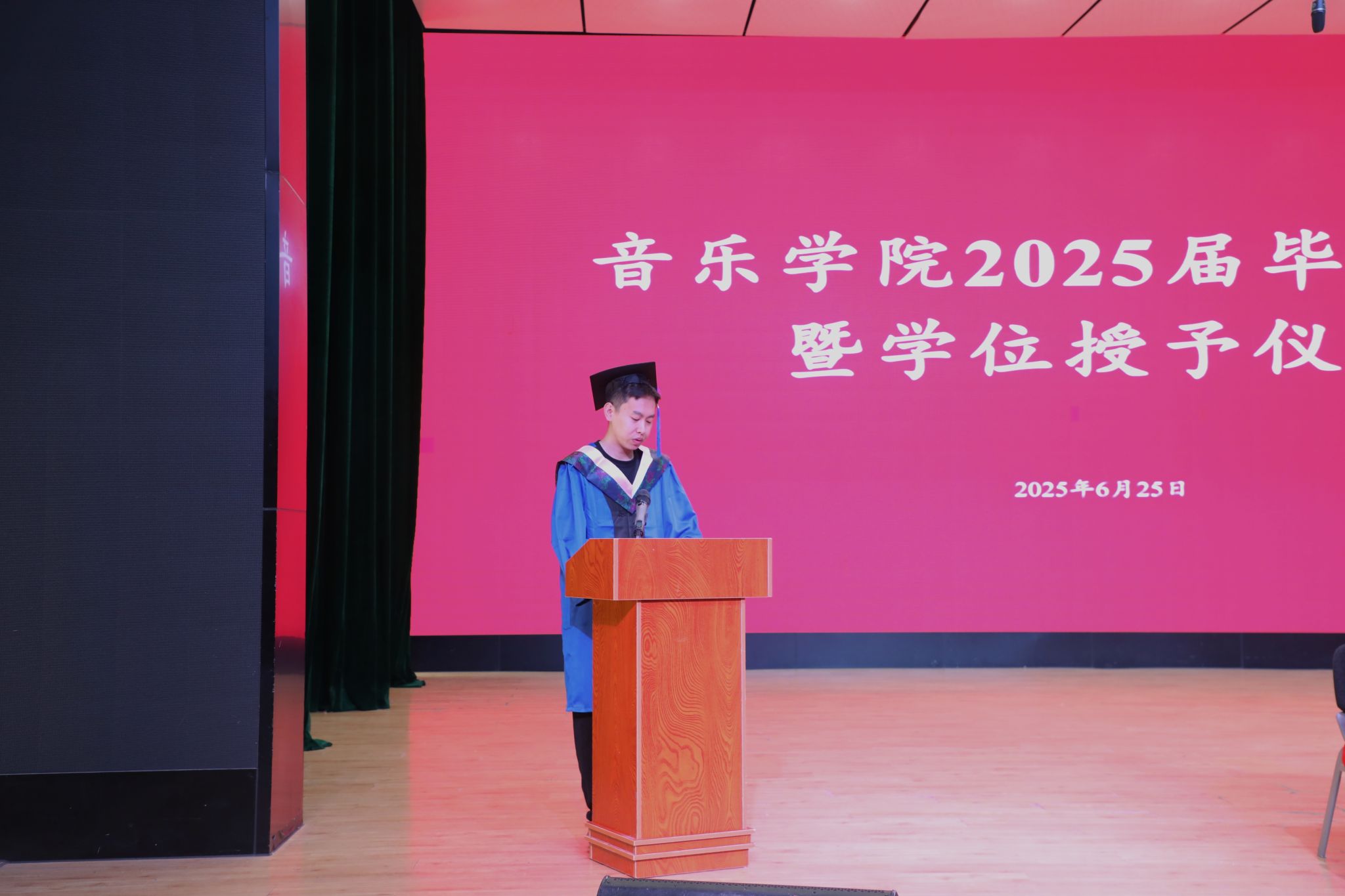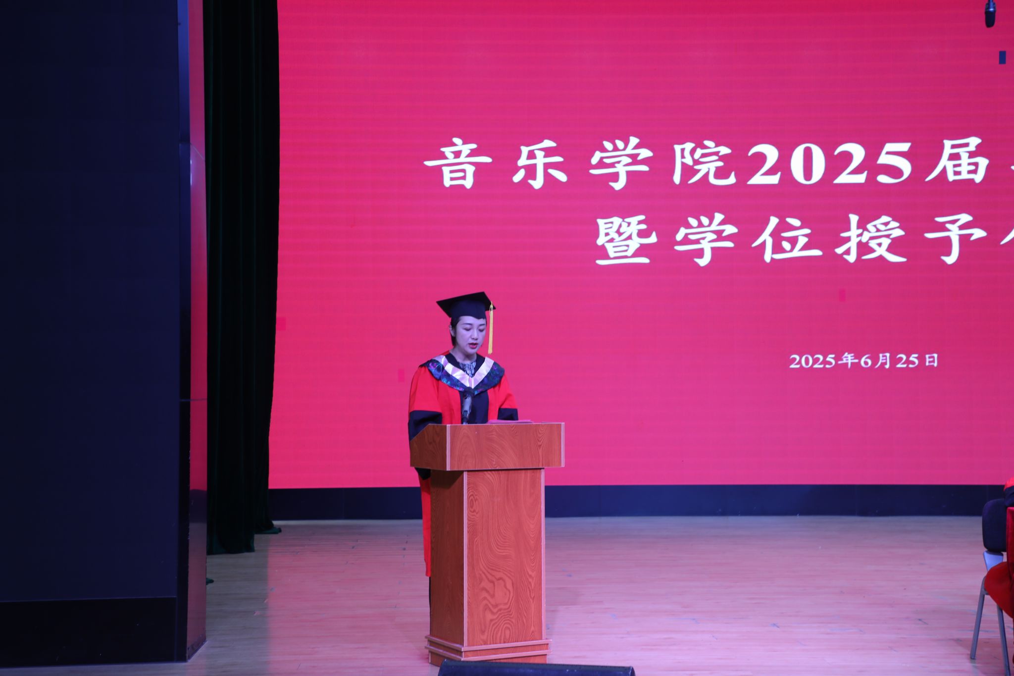 伴随着现场《毕业生成长回顾》和《师长寄语》两段温暖而振奋人心的视频,与会师生有序入场,典礼在庄严的国歌声中拉开了序幕。副院长侯静宜教授宣读省级优秀毕业生名单、副院长曹智武副教授宣读授予硕士学位和学士学位的毕业生名单。