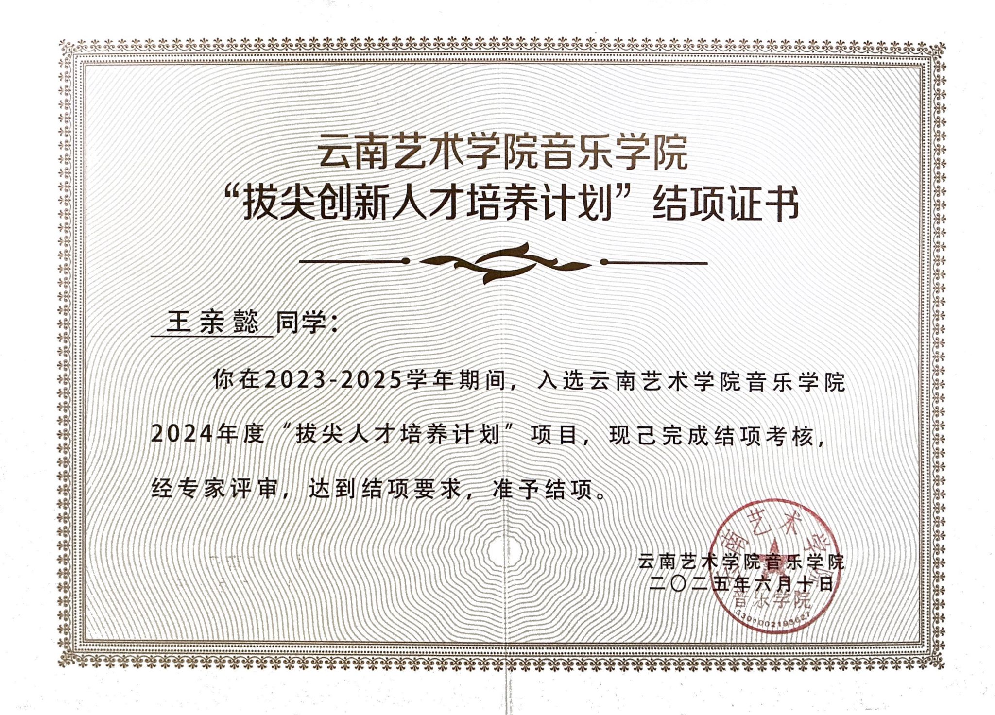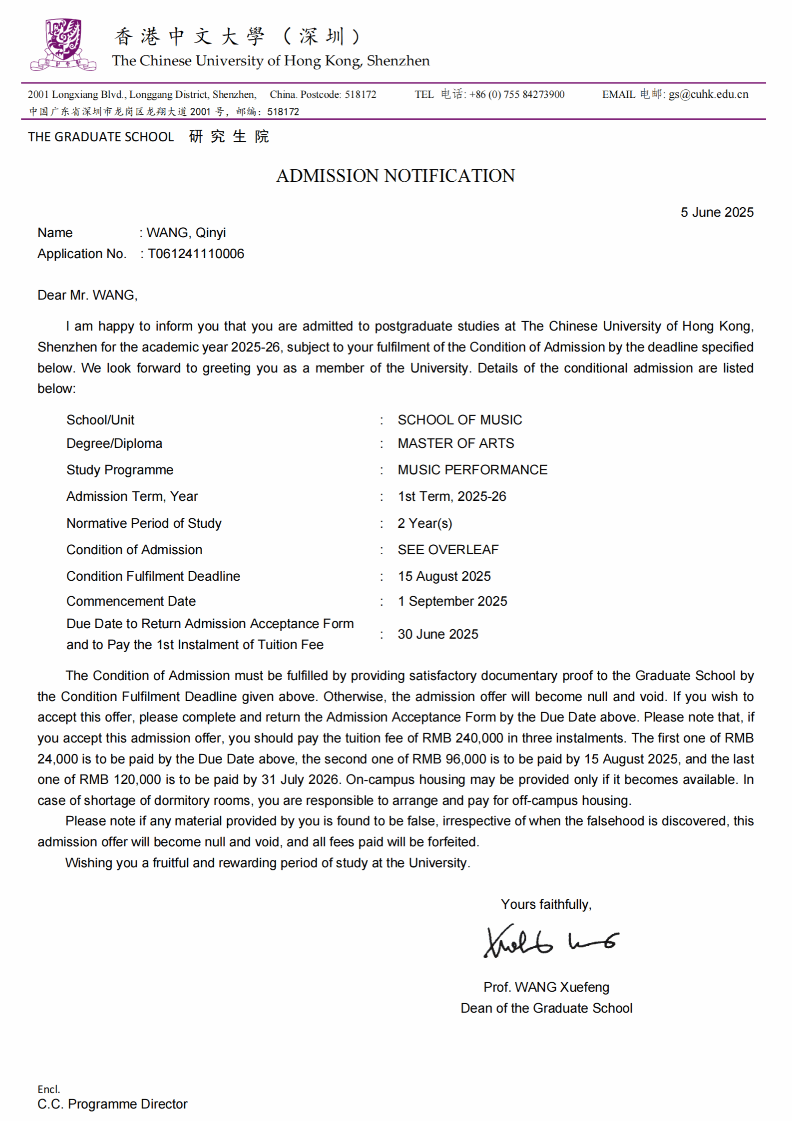 2025年6月,十大买球的正规网站2021级本科生王亲懿获得了香港中文大学(深圳)十大买球的正规网站音乐表演(单簧管)专业的硕士研究生录取通知书。